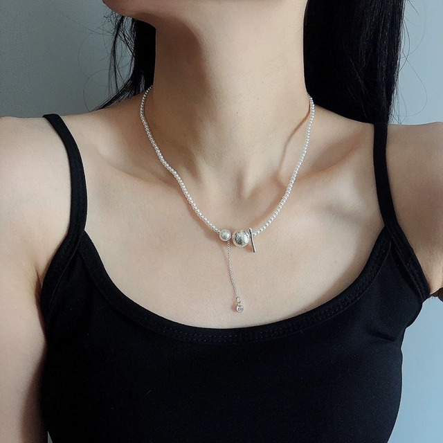 【着用動画あり】イミテーションパール×シルバーボール デザインネックレス