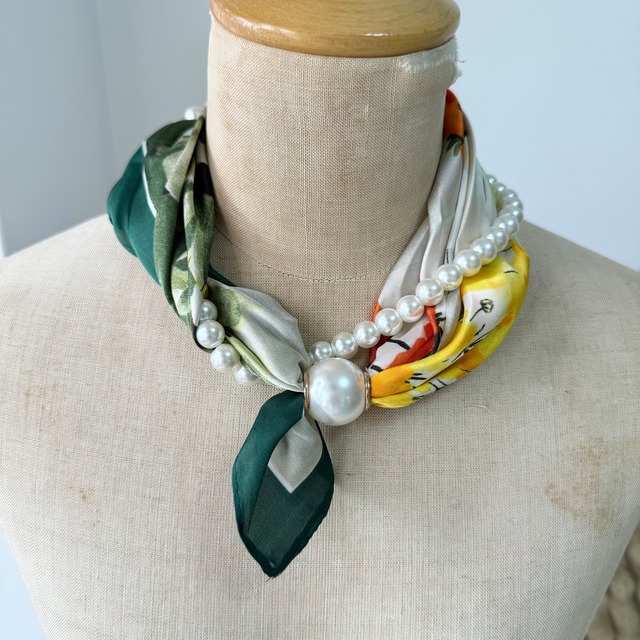 【着用動画あり】グリーンフラワー|スカーフ×パール 2点セットネックレス