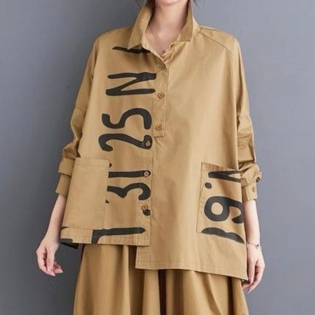 \落ち着いた色味と遊び心を両立した、大人のモードシャツ/ 大胆なブラックロゴが映えるベージュカラーのプリントシャツ。 背中のボタンやゆったりした落ち感シルエットで、リラックス感とモード感を同時に楽しめます。 落ち着いた色味なので、シックにもカジュアルにも◎ セットアップでの着用はもちろん、デニムや黒パンツとも好相性。 ⸻ 【素材】 ・ポリエステル混(軽くて柔らかい、シワになりにくい素材) ・背面ボタンデザイン ・ゆったりドロップショルダー ・ポケットあり/裏地なし ⸻ 【サイズ】 ・着丈:70cm ・袖丈:72cm(肩落ち込み) ・バスト:156cm ・フリーサイズ(M〜2XL相当) ⸻ 【お手入れ方法】 ・ネット使用または手洗い推奨 ・乾燥機不可/陰干し ・アイロンは当て布&低温で ⸻ 【オススメコーデ】 ▶色違いをチェック [グリーン](https://www.modely.jp/item/1287) ▶︎セットアップのボトムをチェック [ボトムス](https://modely.jp/item/1290) 【発送について】 海外お取り寄せ商品のため、ご注文から14~21営業日以内の発送 【お届けについて】 商品が当店に届いてから、検品や洗濯表紙を日本語表記に縫い直す為、発送までに、2〜7日ほどお時間をいただいております。 地域や配送状況によりお届けまでの日数が前後することがございます。 お急ぎの場合は、お問い合わせフォームよりご連絡ください。 大切なお品物を確実にお届けするため、追跡番号付き(佐川急便)での発送を行っております。 万が一の紛失や配送トラブルを防ぐための対応となりますので、あらかじめご了承ください。 当店ではオンラインショップとポップアップショップにて在庫を共有しております。 システムで在庫管理を行っておりますが、タイミングにより在庫数のずれが生じ、ご注文後に欠品となる場合がございます。 人気商品はご注文が集中しやすいため、在庫更新が間に合わない場合がございます。 その際は、メーカーからのお取り寄せの可否や納期の目安を確認のうえ、速やかにご連絡いたします。 また、商品画像はできる限り実物に近いカラーで掲載しておりますが、閲覧環境や端末の違いにより、色味や質感が実物と異なって見える場合がございます。予めご了承ください。 当店の商品は海外からのお取り寄せ品が多数ございます。 関税審査の状況や、現地の大型連休(特に中国の旧正月前後)などにより、お届けに通常よりお時間をいただく場合がございます。 お客様にはご不便をおかけいたしますが、何卒ご理解賜りますようお願い申し上げます。 ⸻ 【返品・交換について】 <返品・返金・交換が可能な場合> ・ご注文内容と異なる商品が届いた場合 ・商品到着時に破損や不良があった場合 上記の条件に該当する場合のみ、ご対応いたします。 ⸻ <返品・返金・交換ができない場合> ・セール品、予約販売商品 ・一度でもご使用になった商品、お洗濯・クリーニングされた商品 ・タグやラベルの破損・汚損・紛失がある商品 ・お客様のもとで破損・汚損・臭いがついた商品 ・商品(箱・包装含む)が、お届け時と著しく異なる状態である場合 ・商品到着後8日以上が経過した商品 ⸻ その他ご不明点がありましたら、お問い合わせよりご連絡ください。 安心してお買い物いただけるよう努めてまいります。