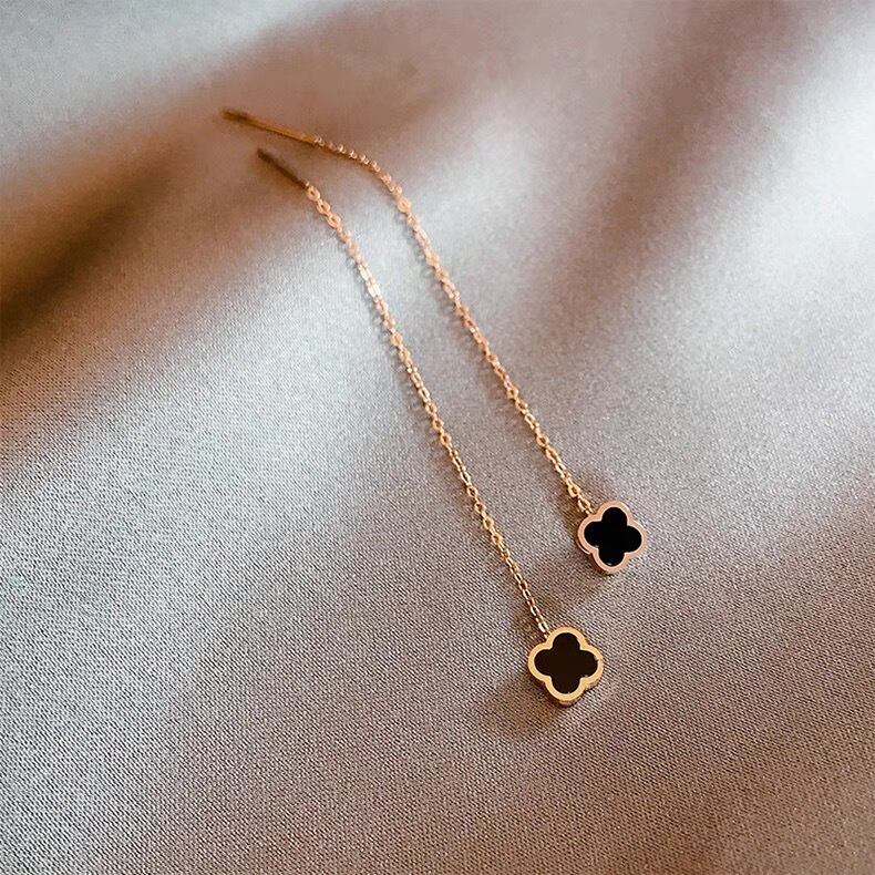 上品なフラワーモチーフがさりげなく揺れる、華奢なチェーンデザインのスレッドピアス。
