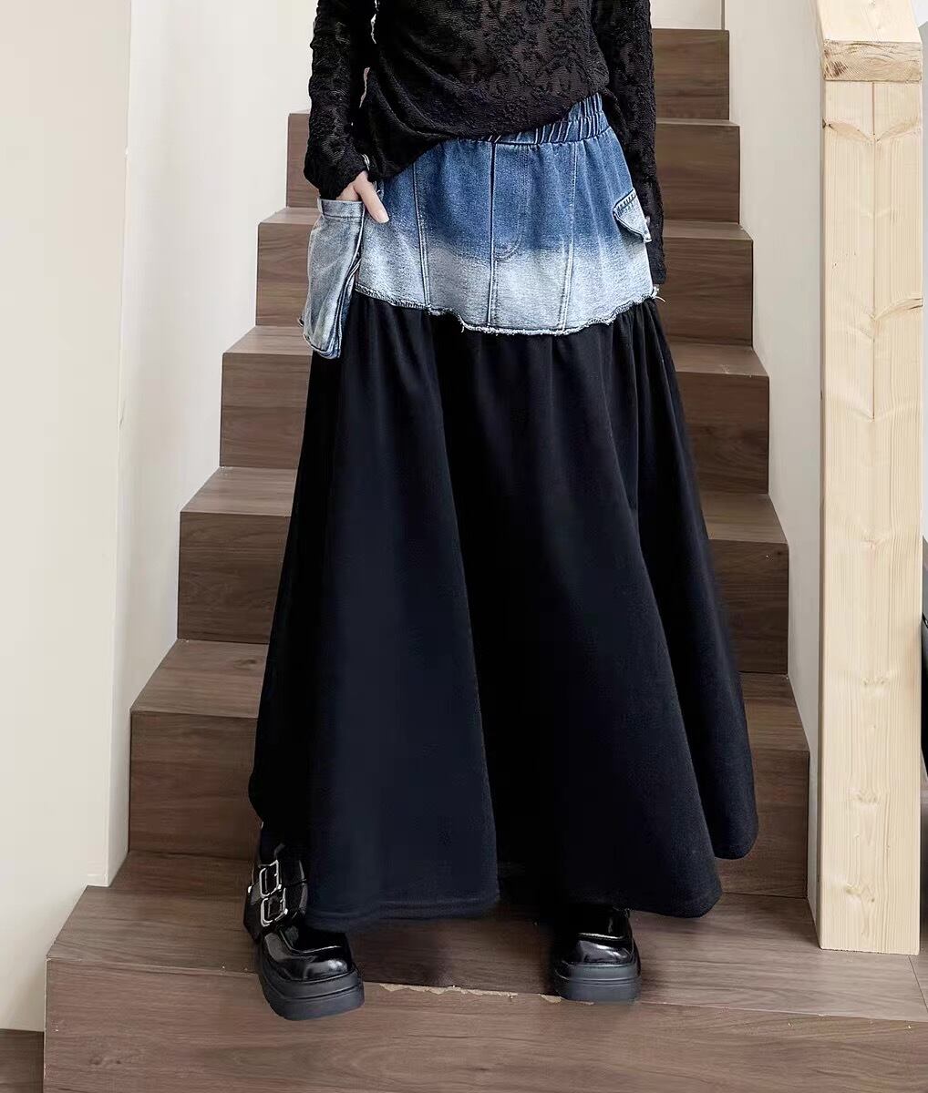 【異素材MIXで映えるデザイン】デニム×ブラックコットンロングスカート|モード感ある切替シルエット