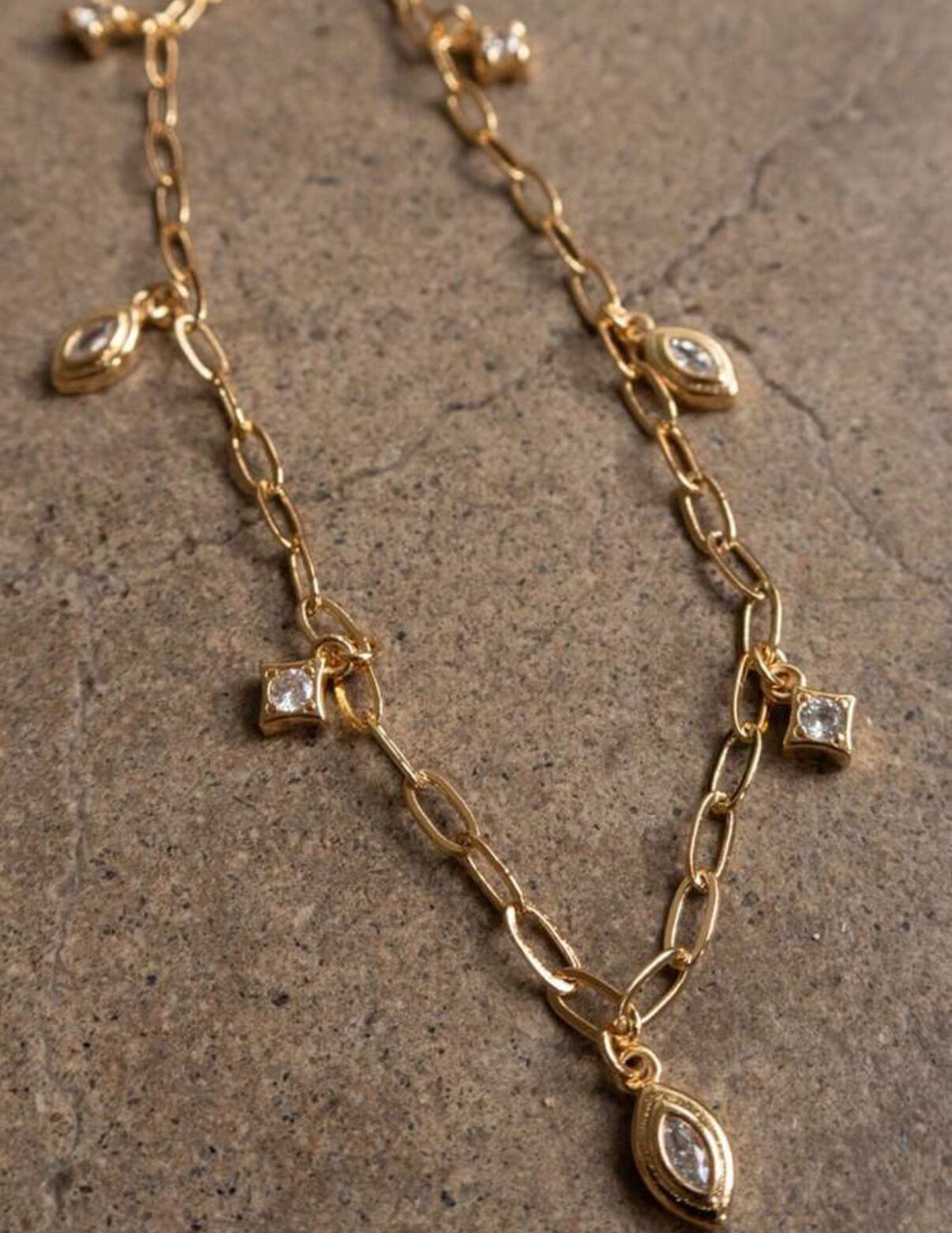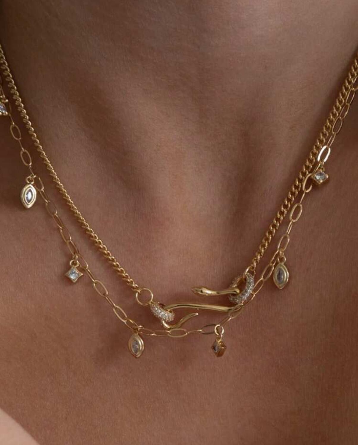 一つひとつのチャームが軽やかに揺れて、首元にさりげない輝きをくれるデザイン。