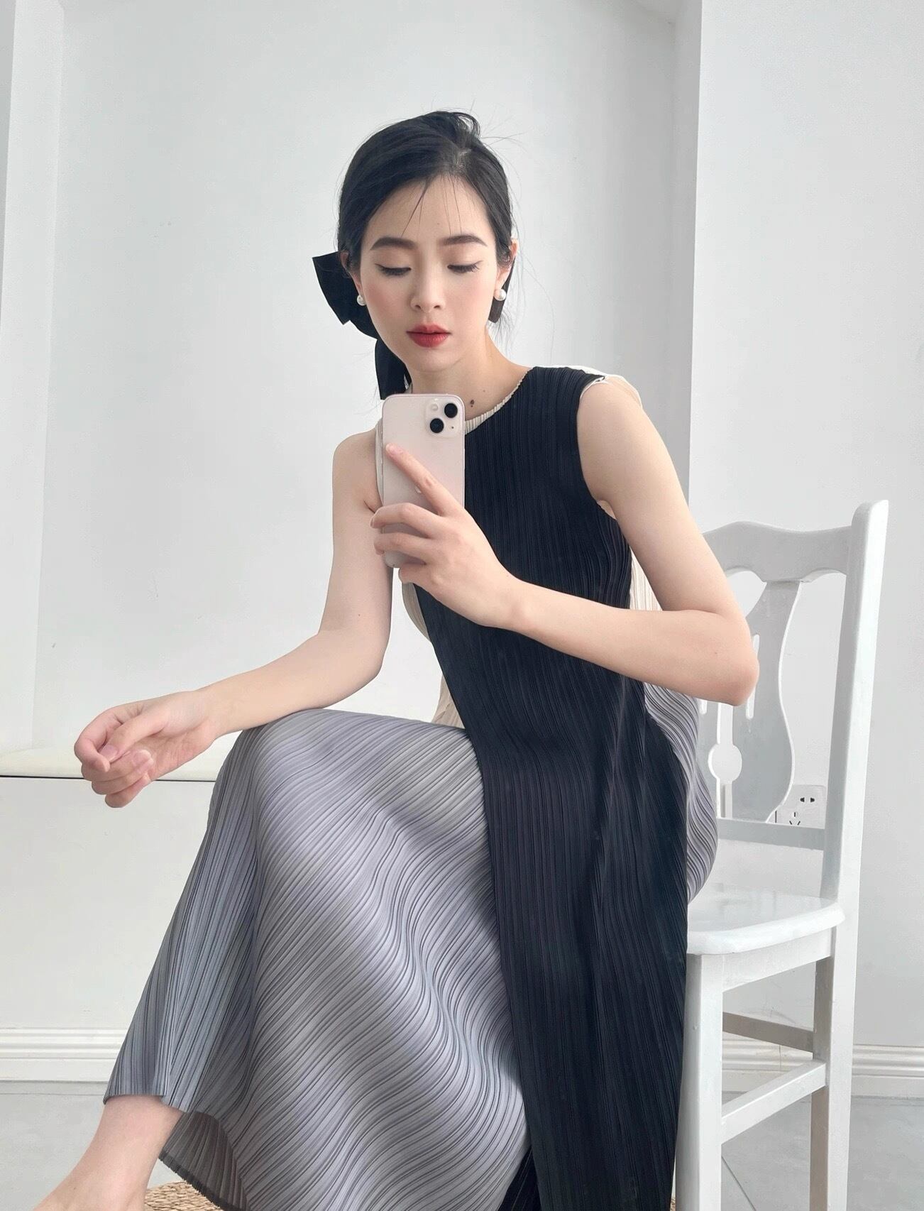 大胆な配色切替が目を惹く、プリーツ加工のノースリーブワンピース。