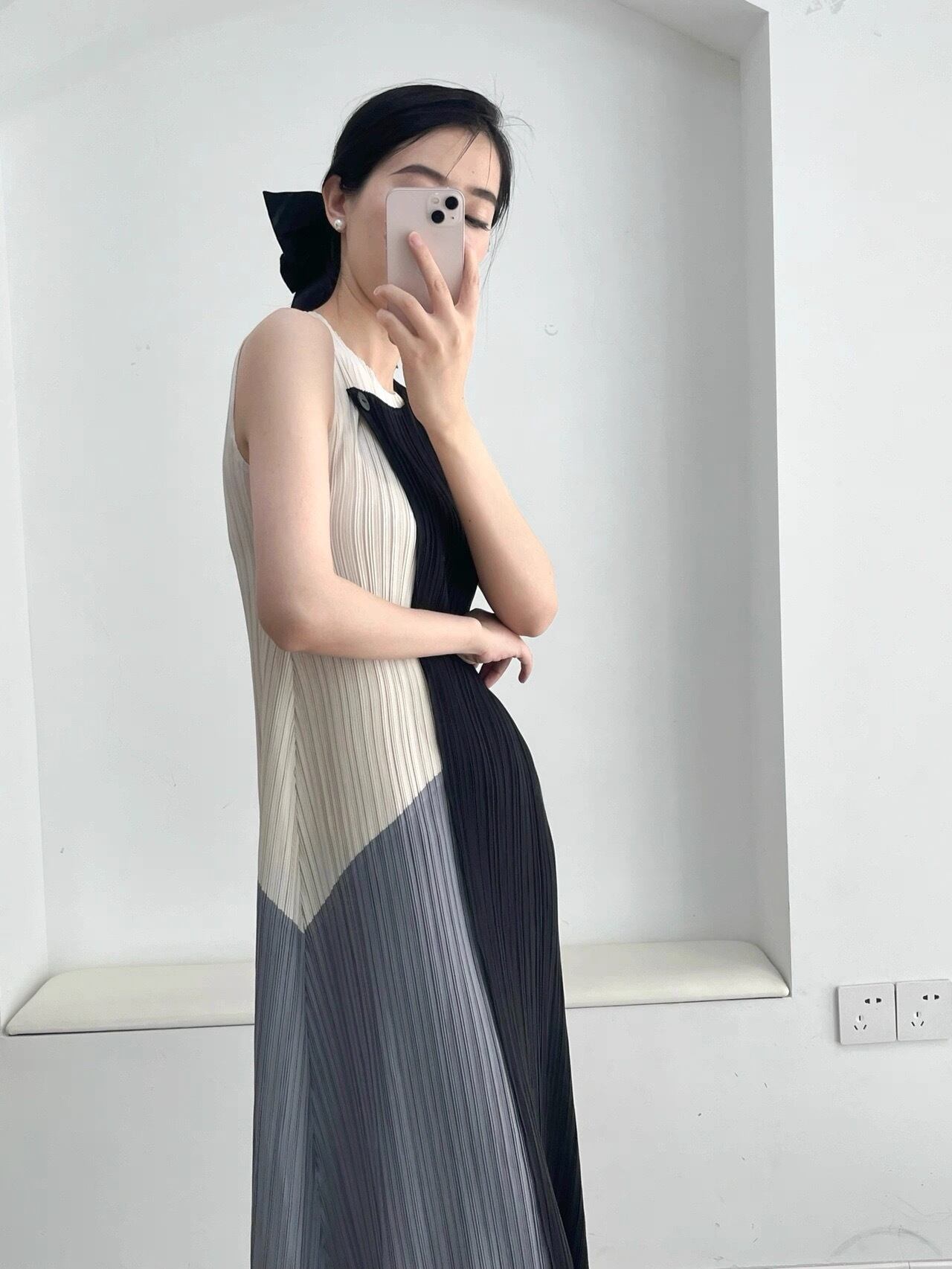 配色ワンピース/プリーツワンピース/ノースリーブワンピース