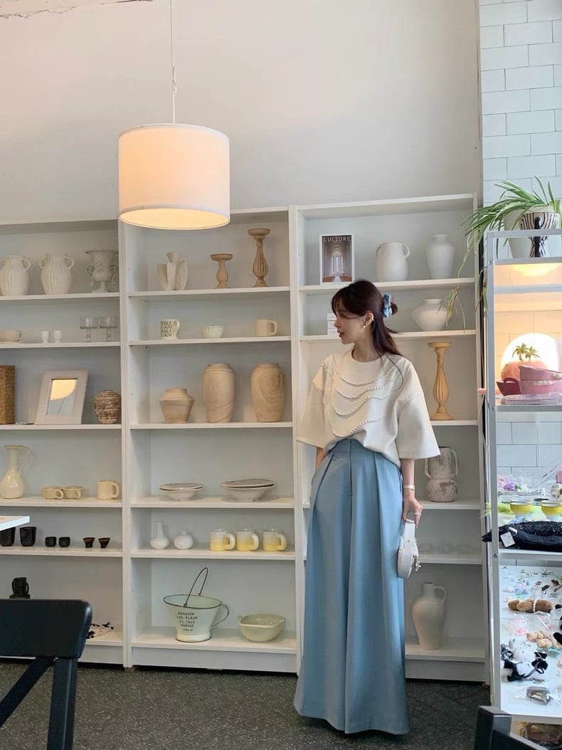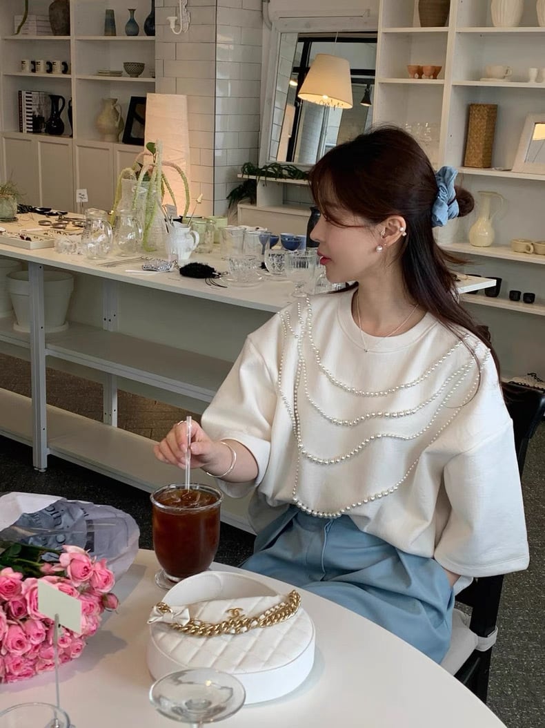 上品で華やかなパール装飾が魅力のホワイトTシャツ。