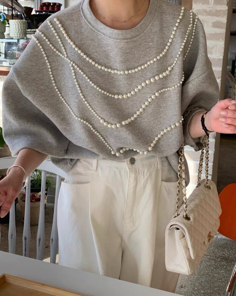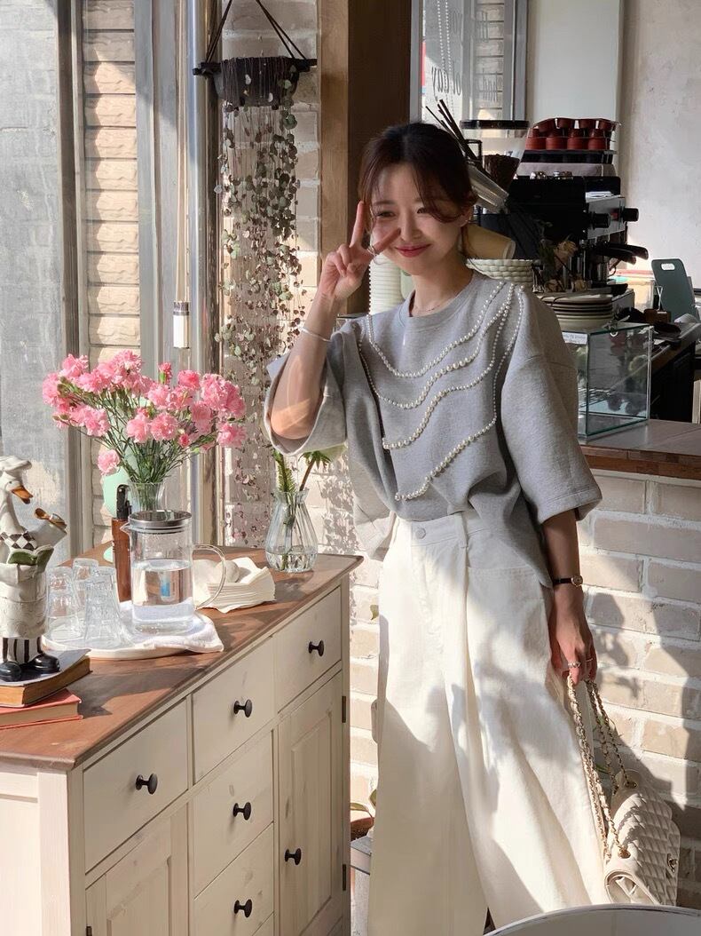 落ち着いたグレーカラーに、パールの装飾が映える大人フェミニンなTシャツ。