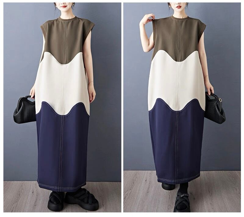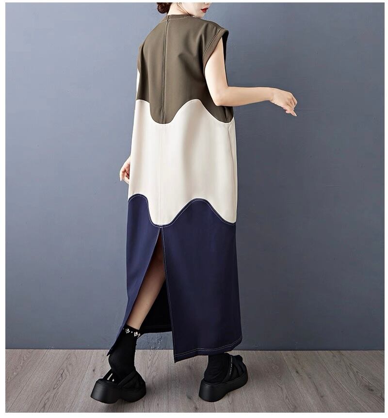 立体的な切替デザインが目を引くノースリーブワンピース。カーキ・アイボリー・ネイビーの3色を大胆にブロッキングし、モード感と上品さを兼ね備えた1枚です。程よくゆとりのあるストレートシルエットで体型を拾わず、リラックス感のある着心地。背面にはスリットを施し、足さばきもスムーズ。首元と袖口はリブ仕立てで、スポーティーさをプラス。大人のデイリーコーデからお出かけスタイルまで幅広く活躍します。
