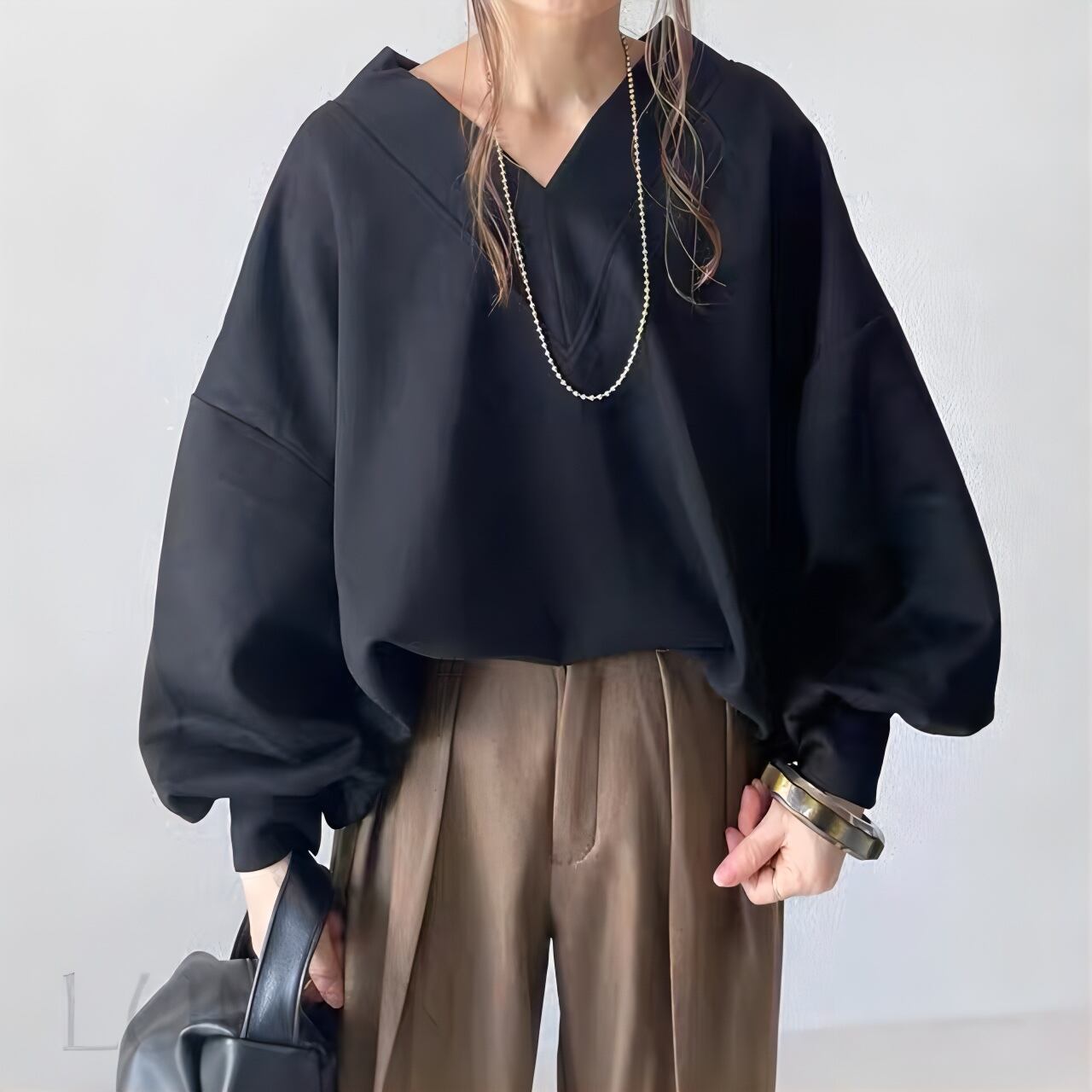 深めのVネックデザインはデコルテをきれいに見せ、女性らしさを引き立てます。