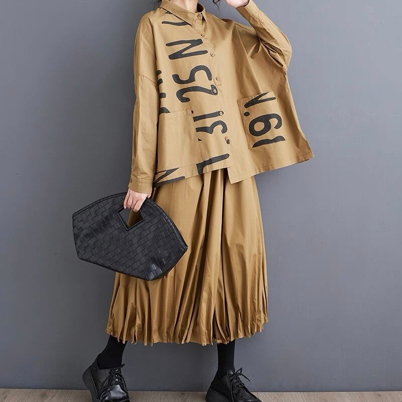 大胆なブラックロゴが映えるベージュカラーのプリントシャツ。