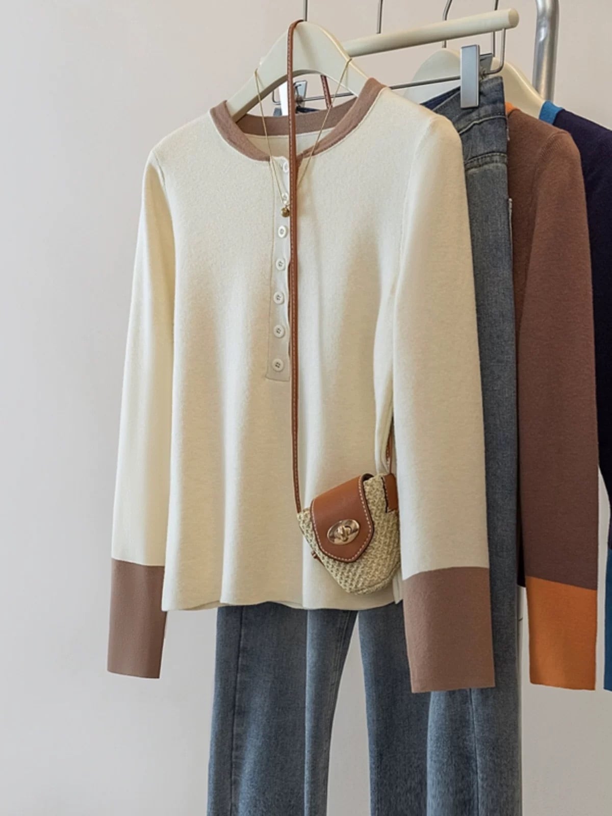 滑らかな肌触りの上質なニット素材を使用し、袖口と襟元にアクセントカラーを効かせたスタイリッシュな1枚。