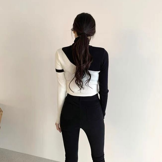 【スタイルアップが叶う】モード配色アシメリブニットトップス(フリーサイズ)