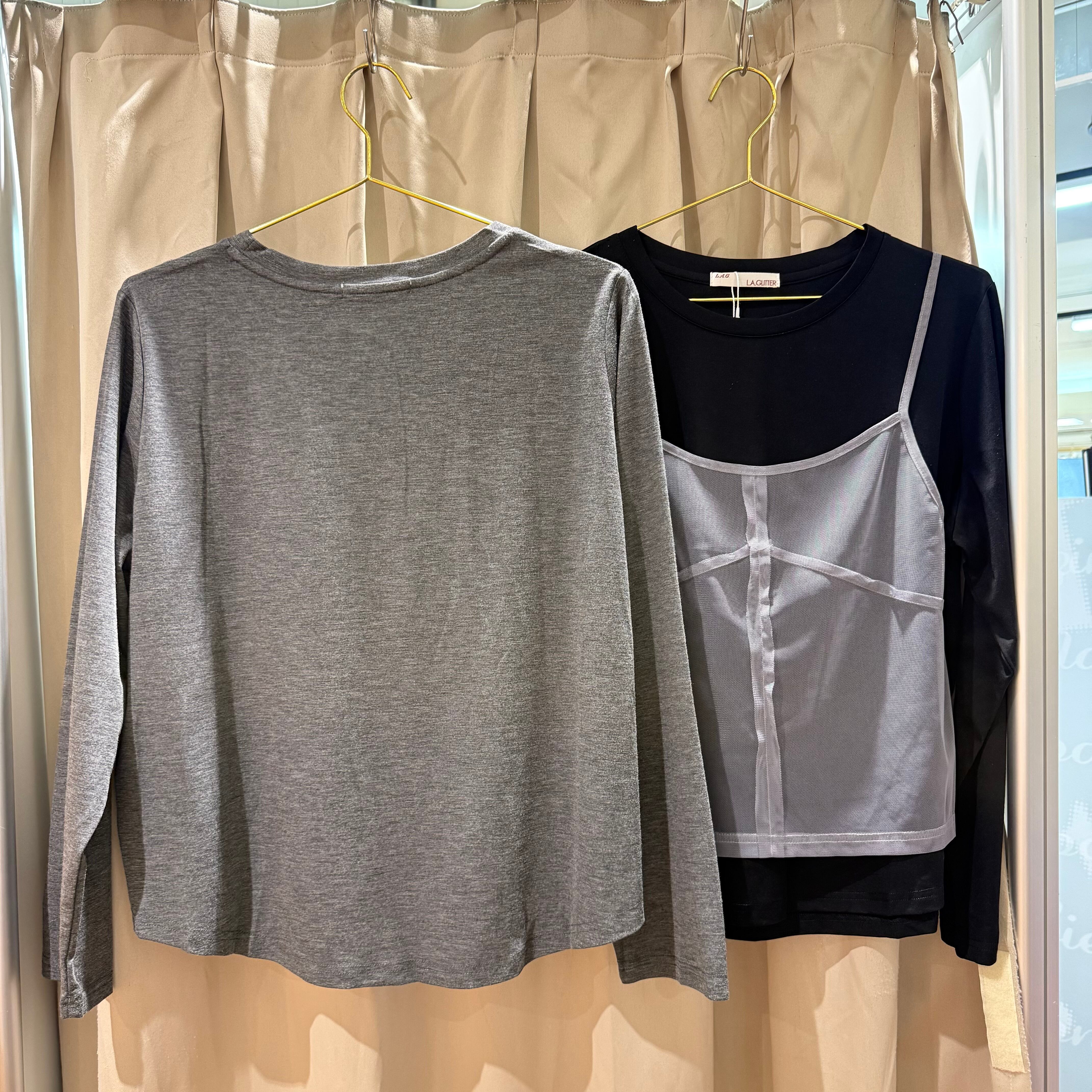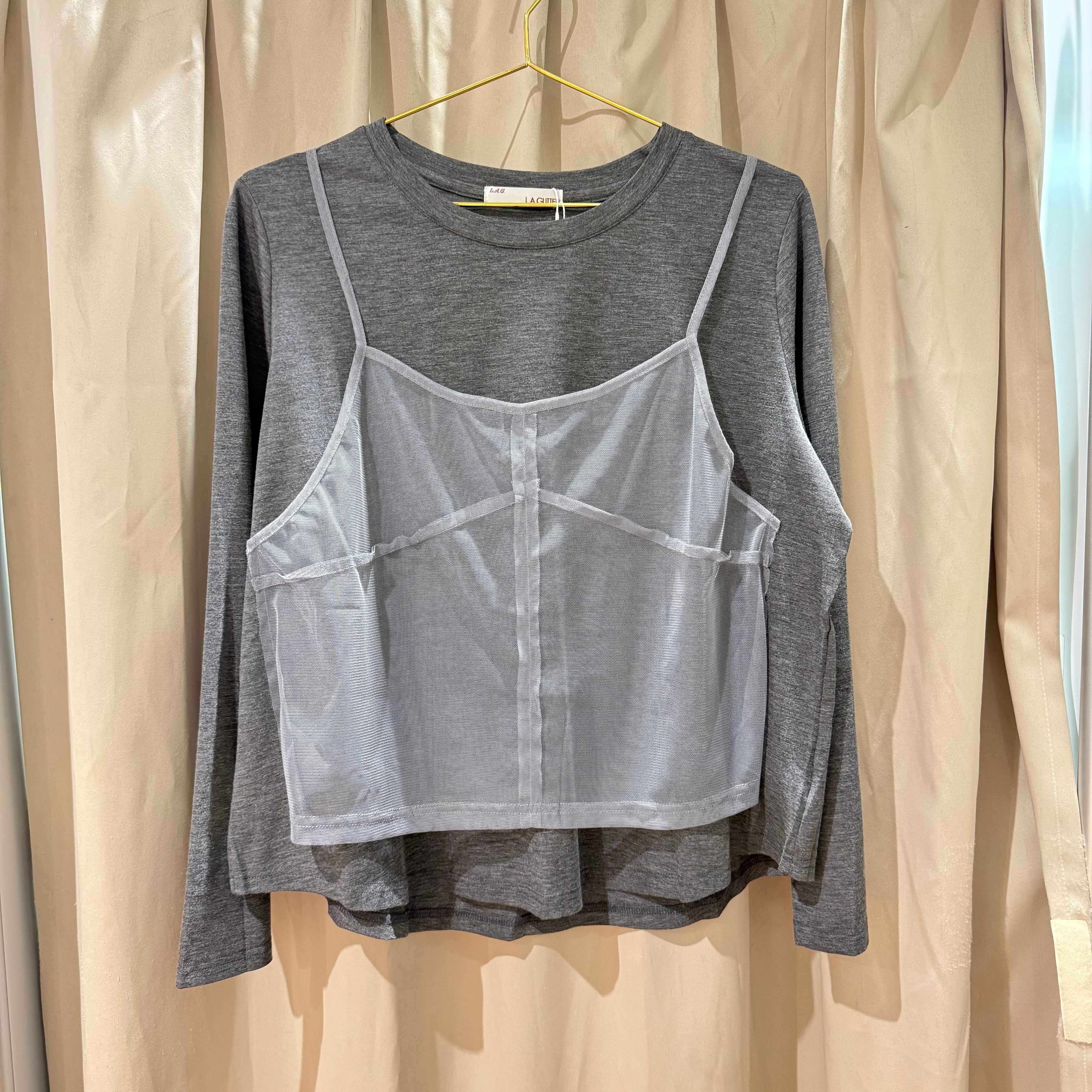 ロンTの上から透け感のあるチュールビスチェを重ねたようなデザインで、1枚で今っぽいレイヤードスタイルが完成。