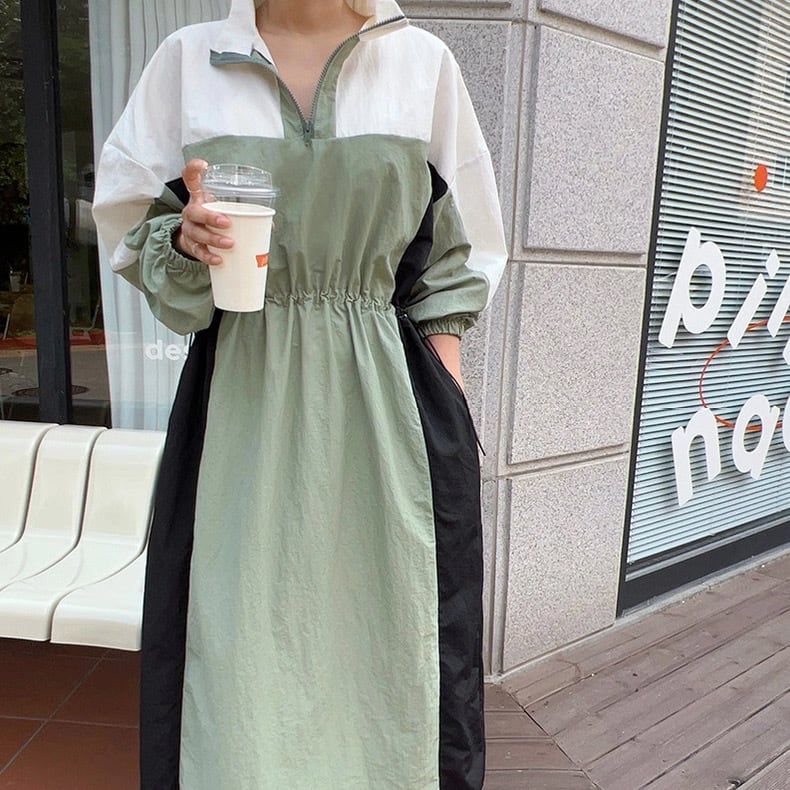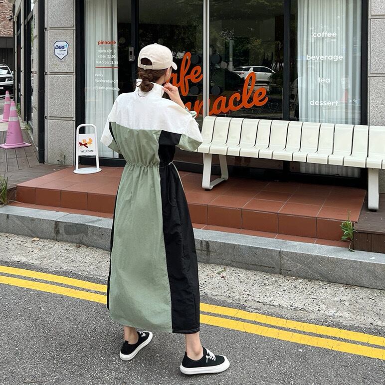 一枚で韓国っぽ旬コーデが完成する、配色切替のスポーティロングワンピ。