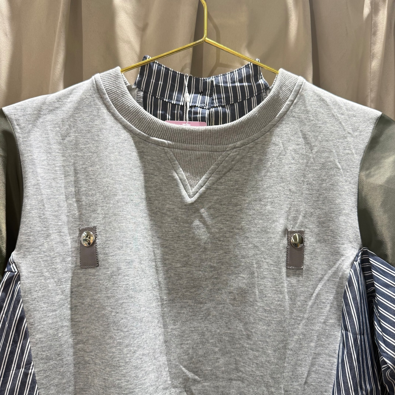 ストライプシャツ×袖ミリタリーナイロン×スウェットボディという