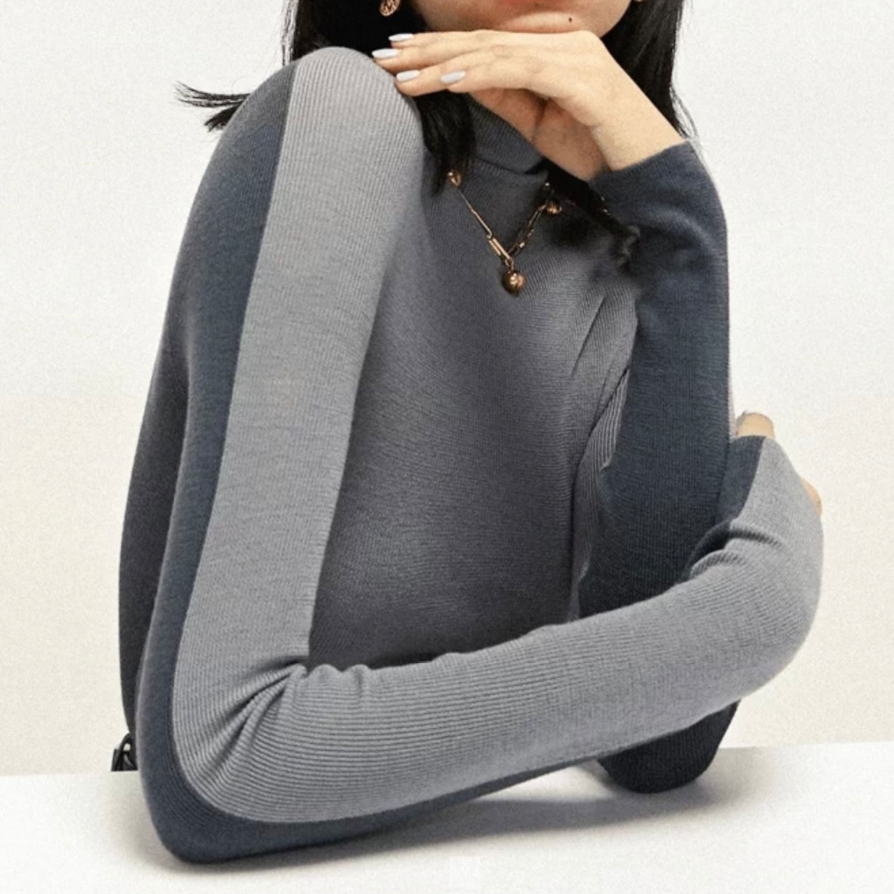 配色スリーブがスタイリングのアクセントになる、ハイネックデザインの長袖トップスです。