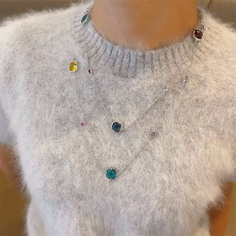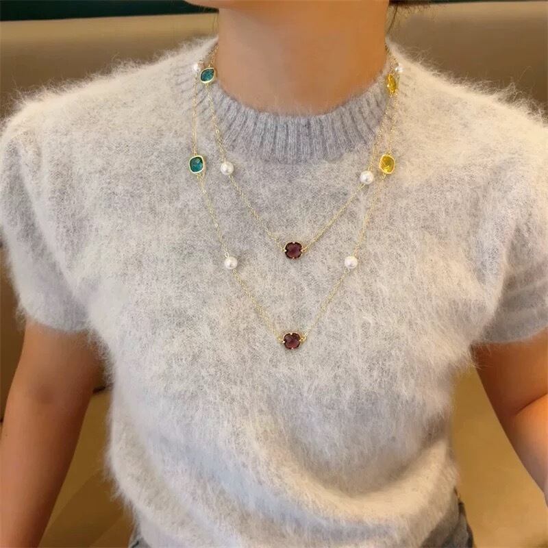 透明感のあるカラーストーンとパールを贅沢に散りばめた、存在感のあるロングネックレス。