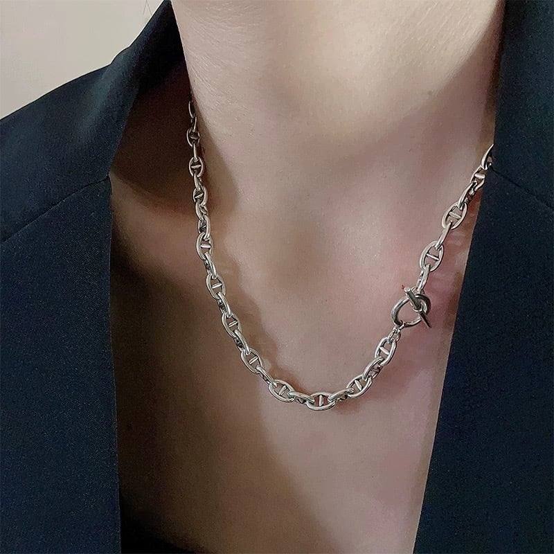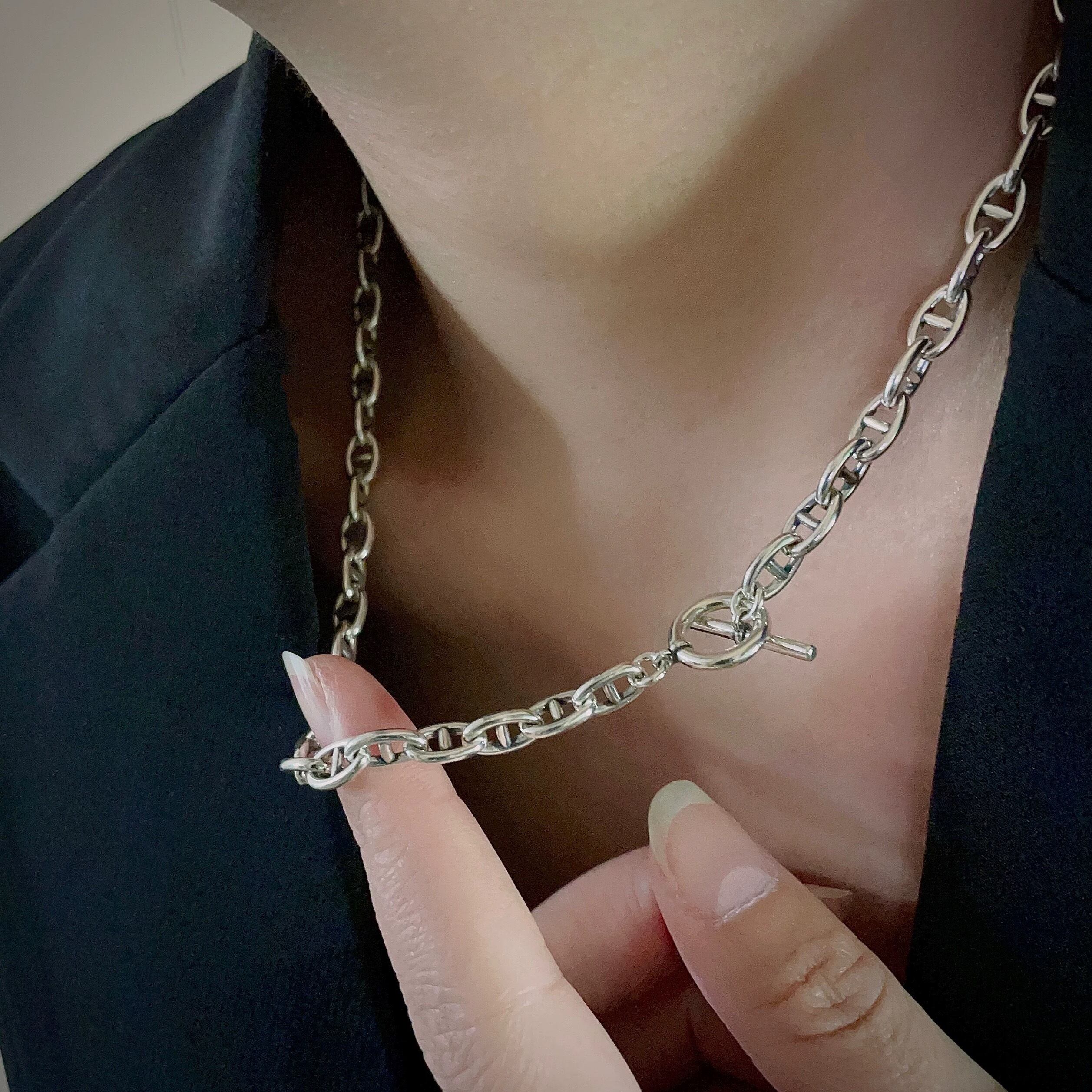 Tバー(金具)デザインがアクセントのチェーンネックレス。