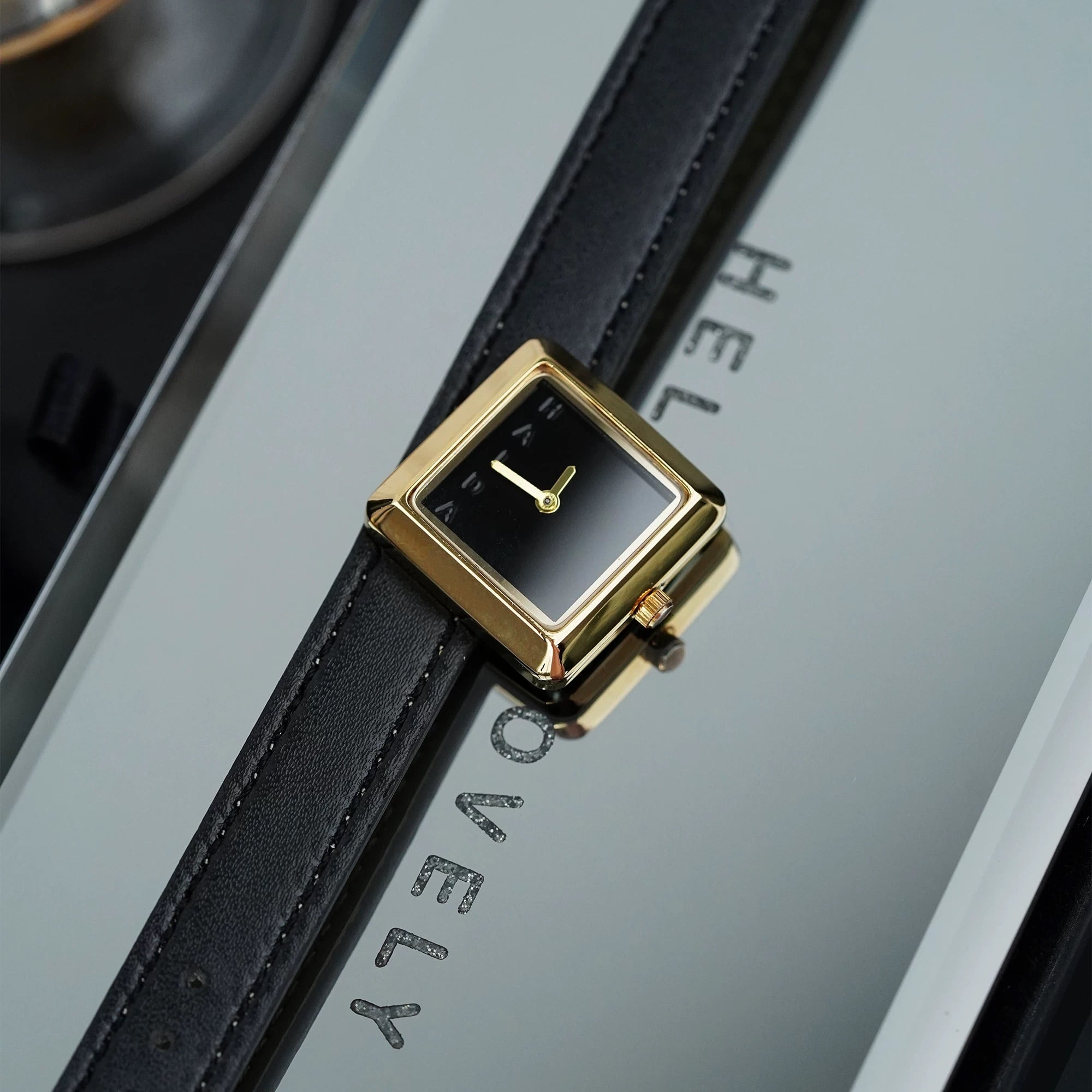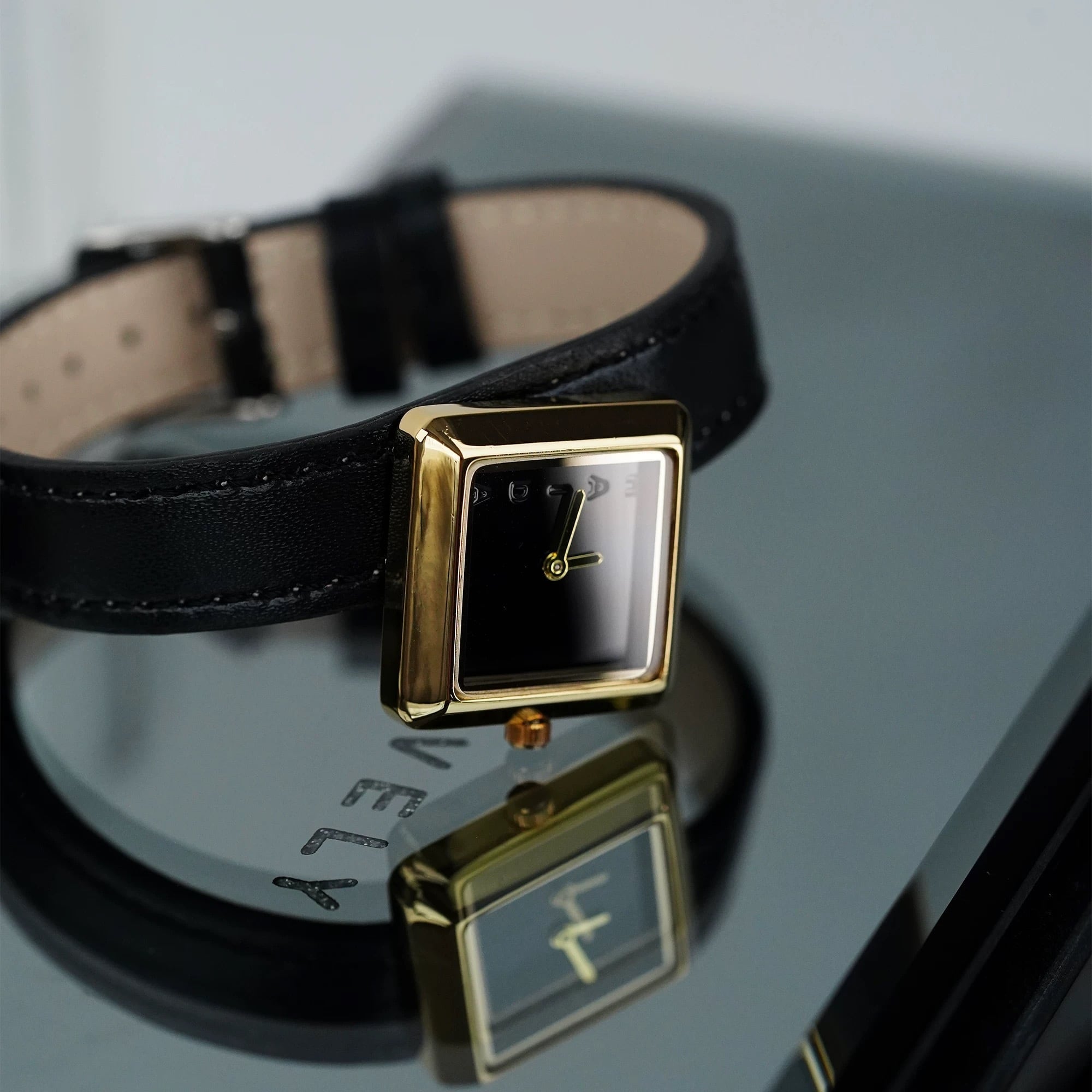 スクエアのミニマルフェイスに、華奢なレザーベルトを合わせたデザインは、