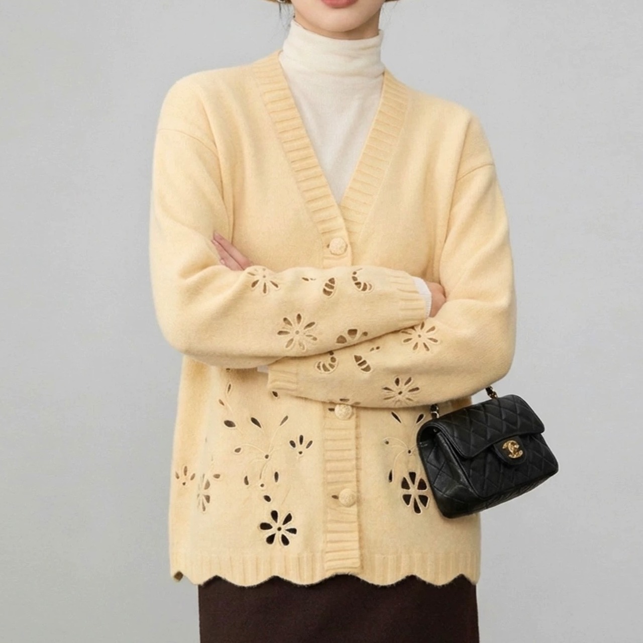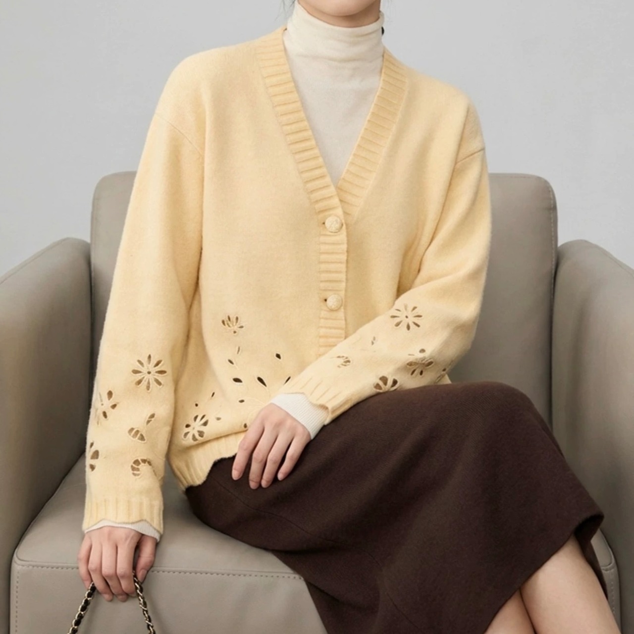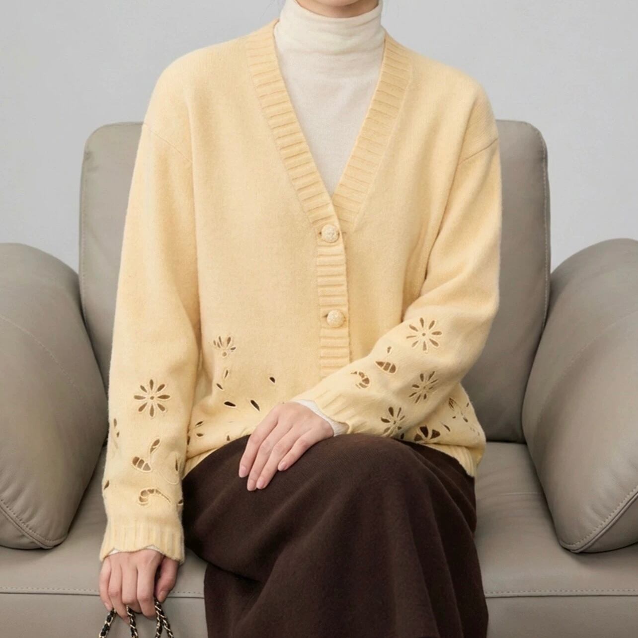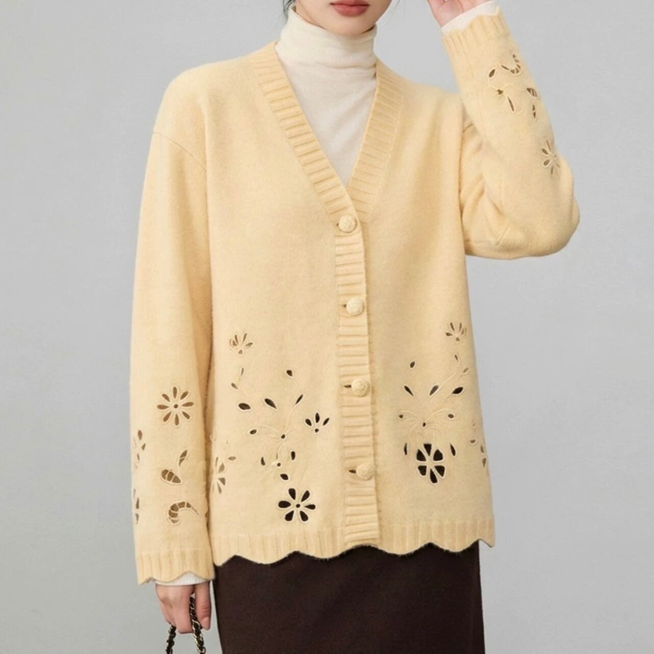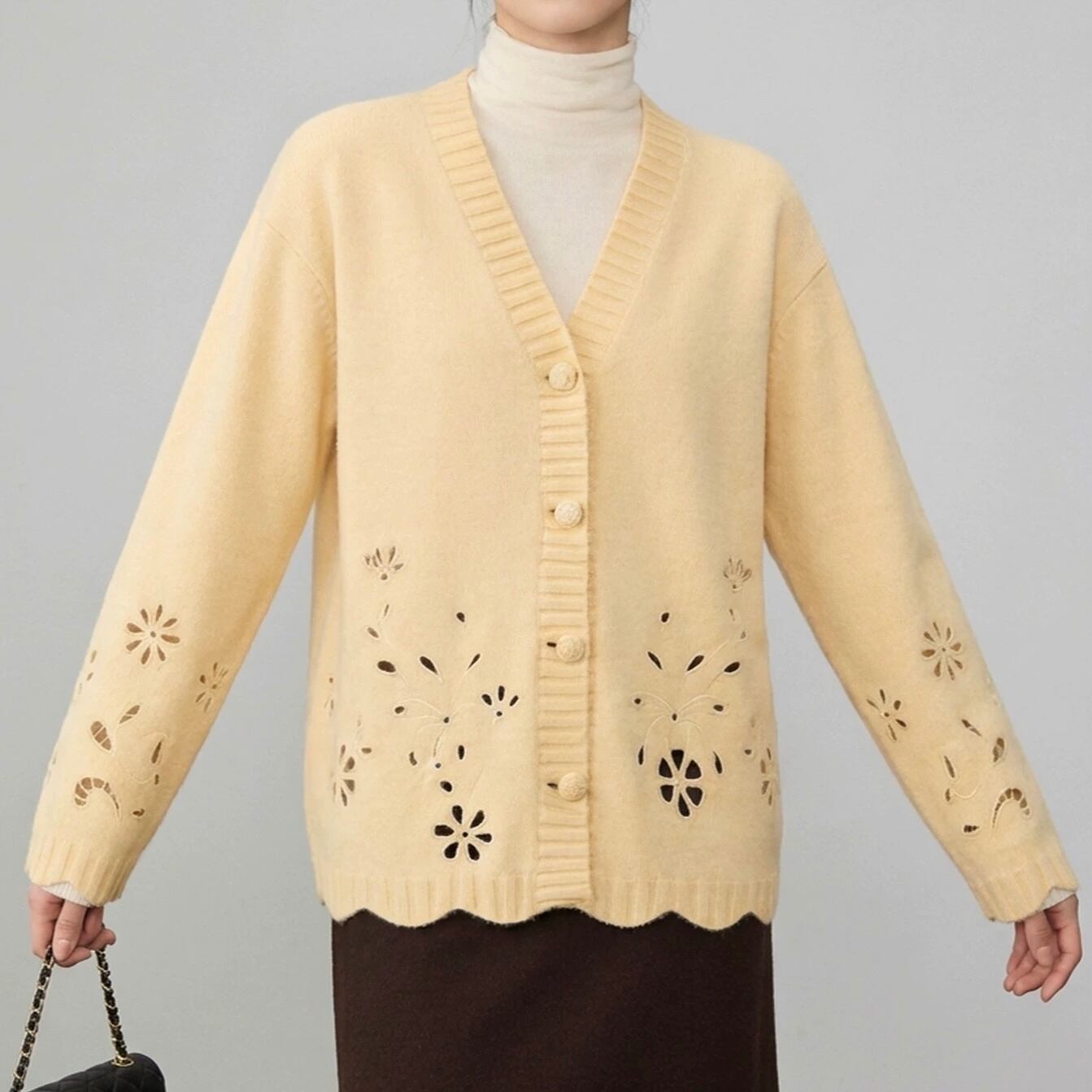 フラワーモチーフのカットワークを施した、表情豊かなカーディガン。