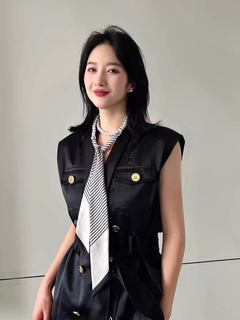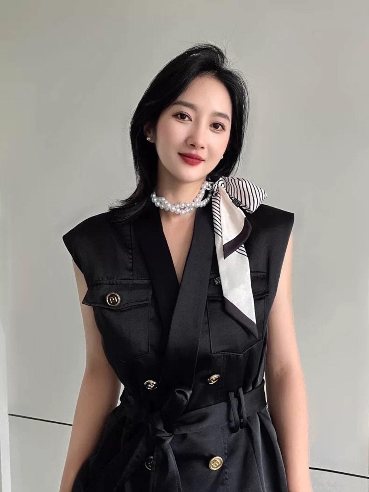 スカーフの動きと柄が加わることで、堅くなりすぎず抜け感のある表情に仕上がっています。