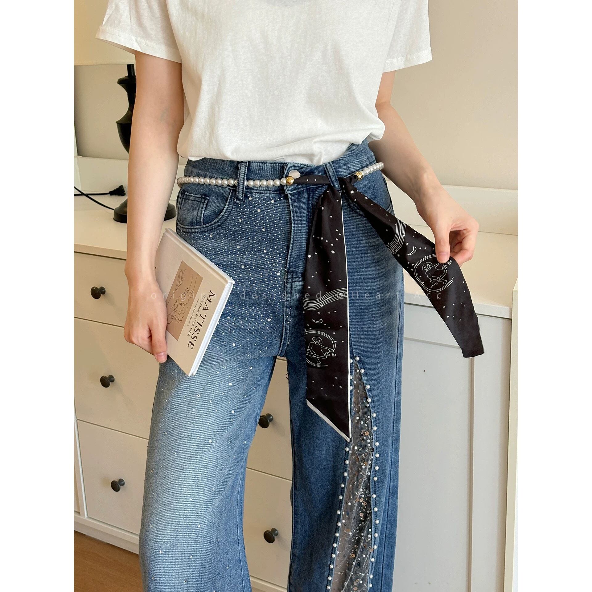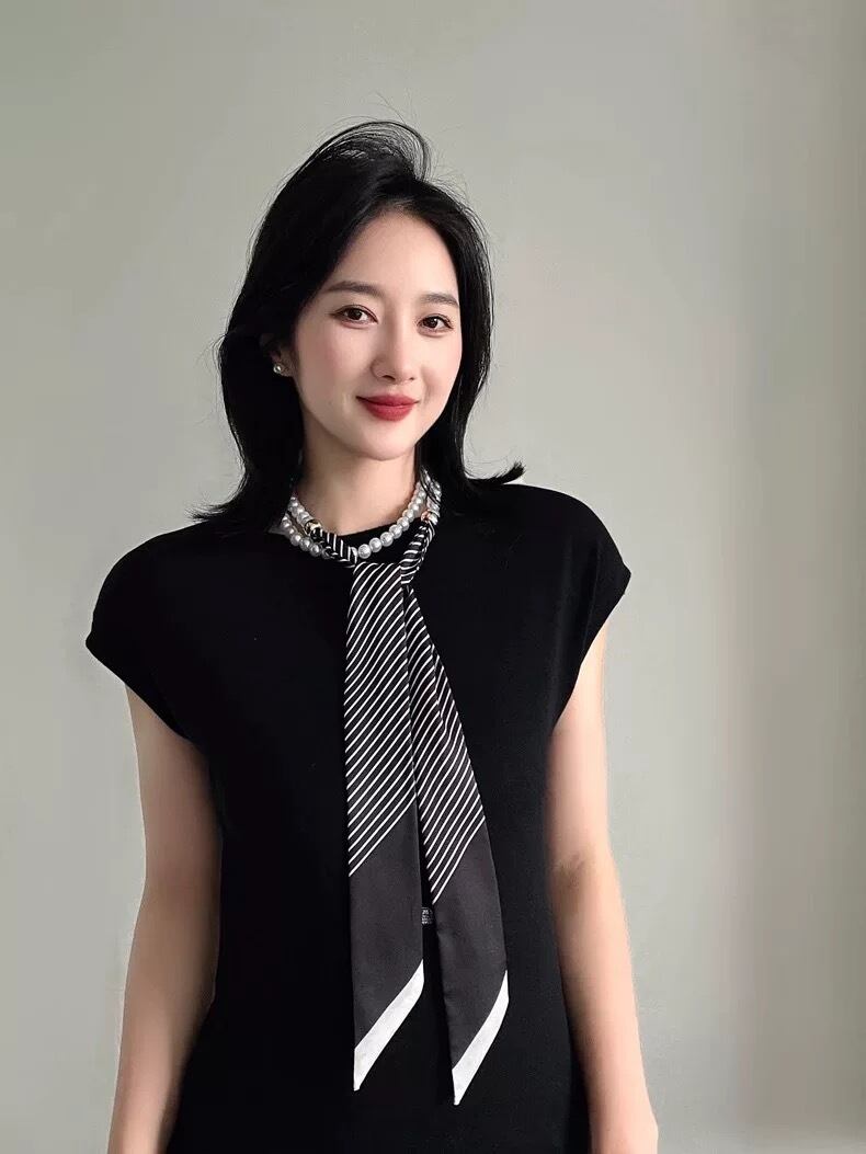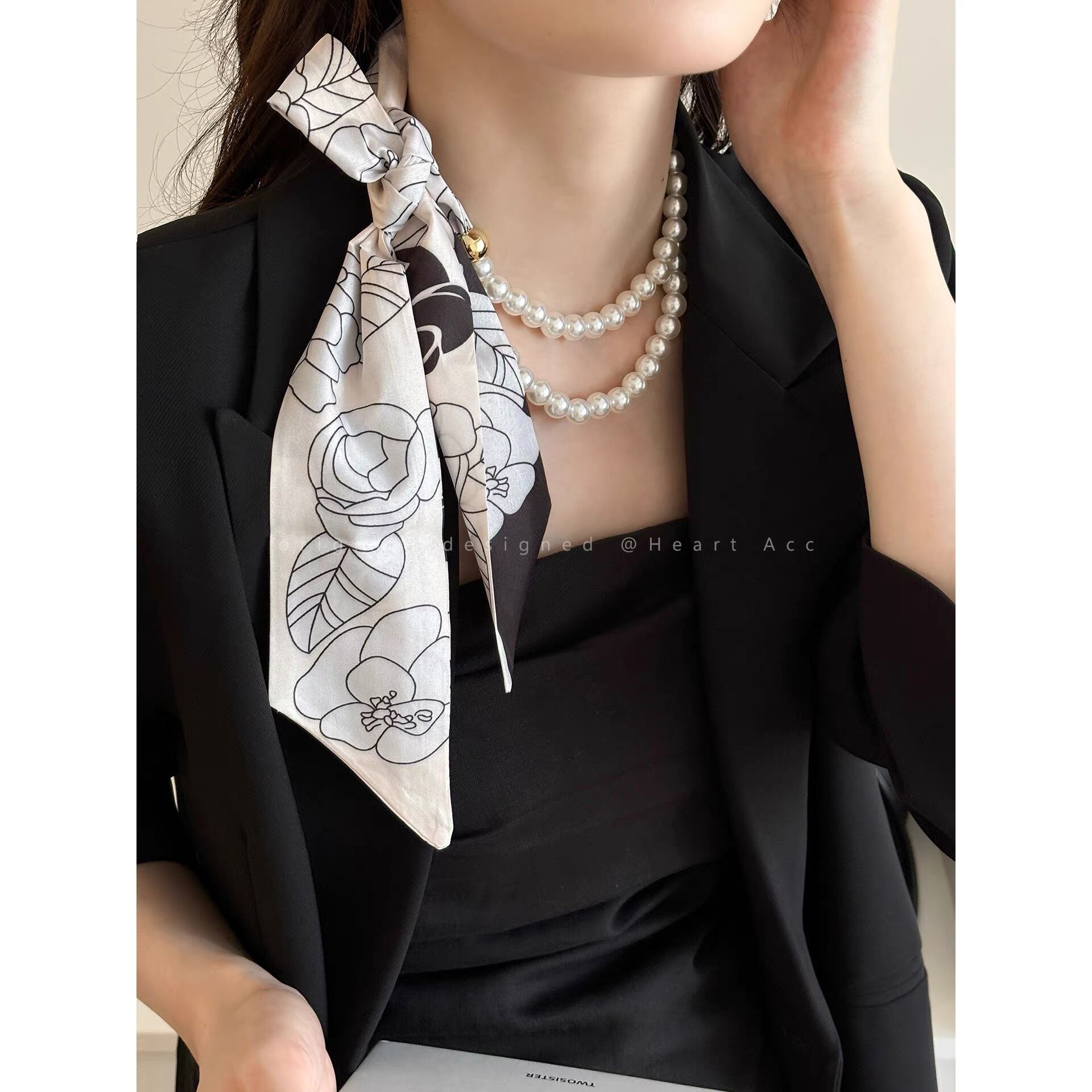 上品なパールネックレスに、滑らかな質感のスカーフをドッキングした、