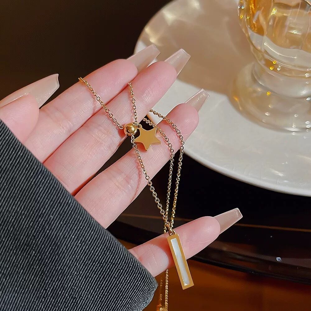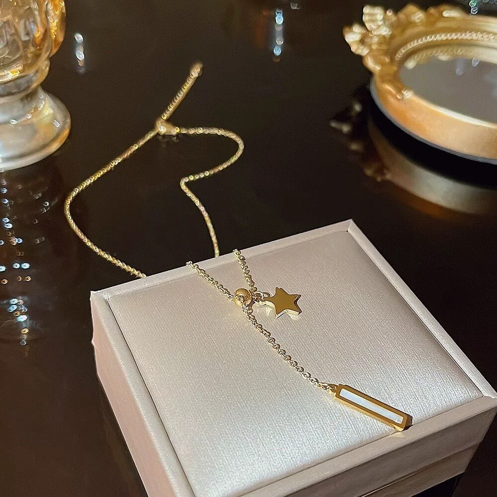 華奢なチェーンに星モチーフと縦ラインのバーを組み合わせた、洗練されたY字デザインのネックレス。