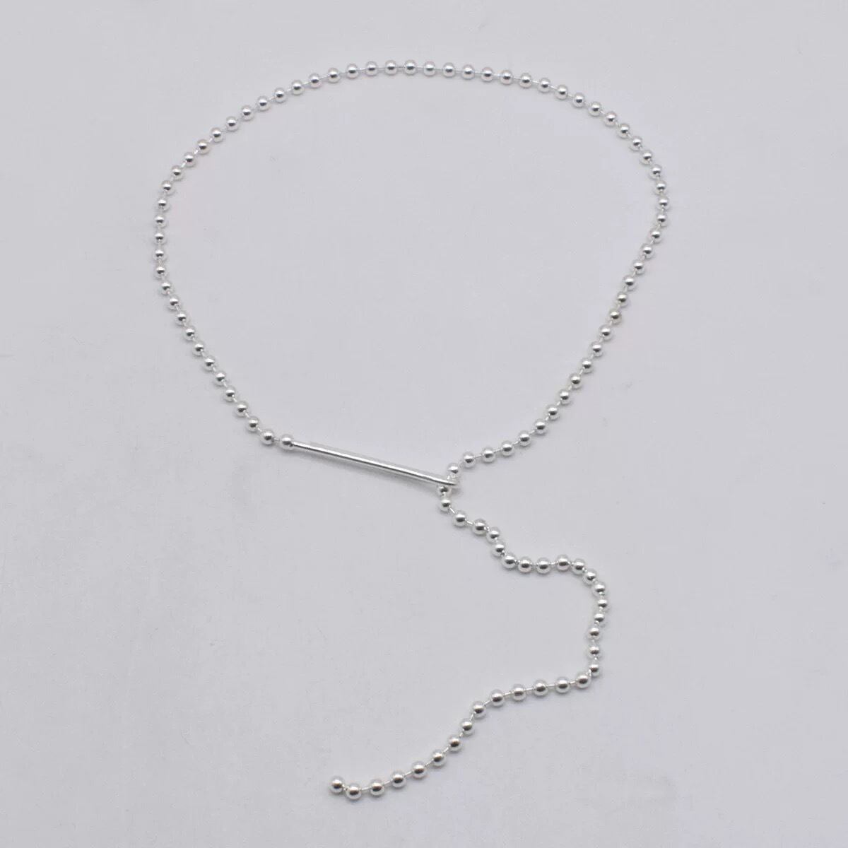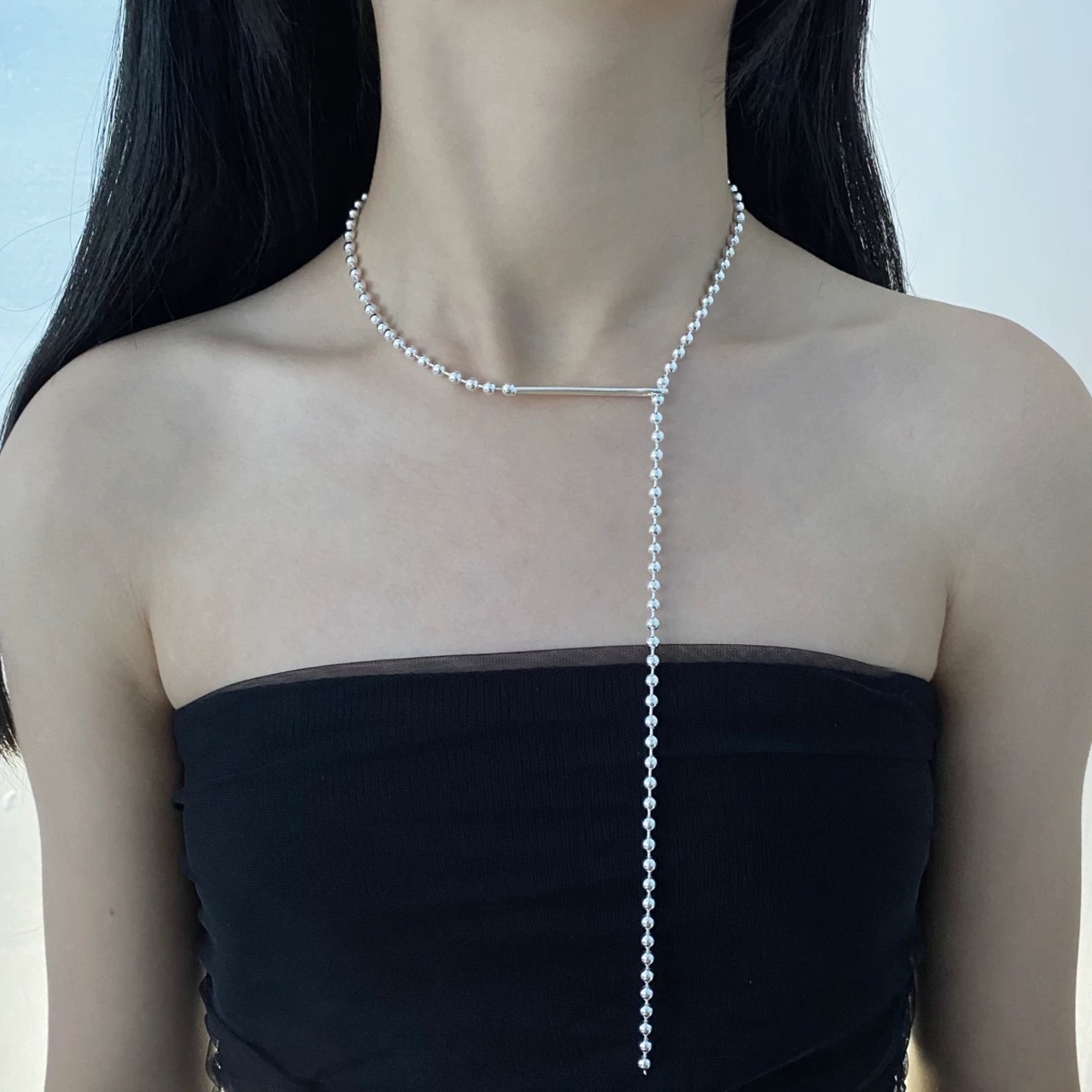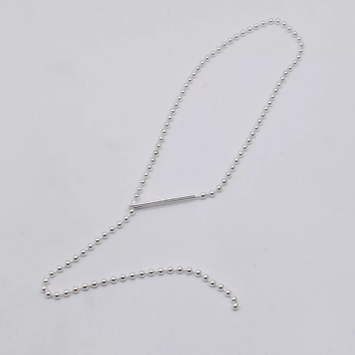 等間隔に並んだボールチェーンと、センターから落ちるYラインデザインが首元をすっきり見せてくれる一本です。