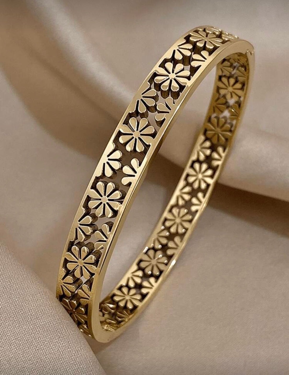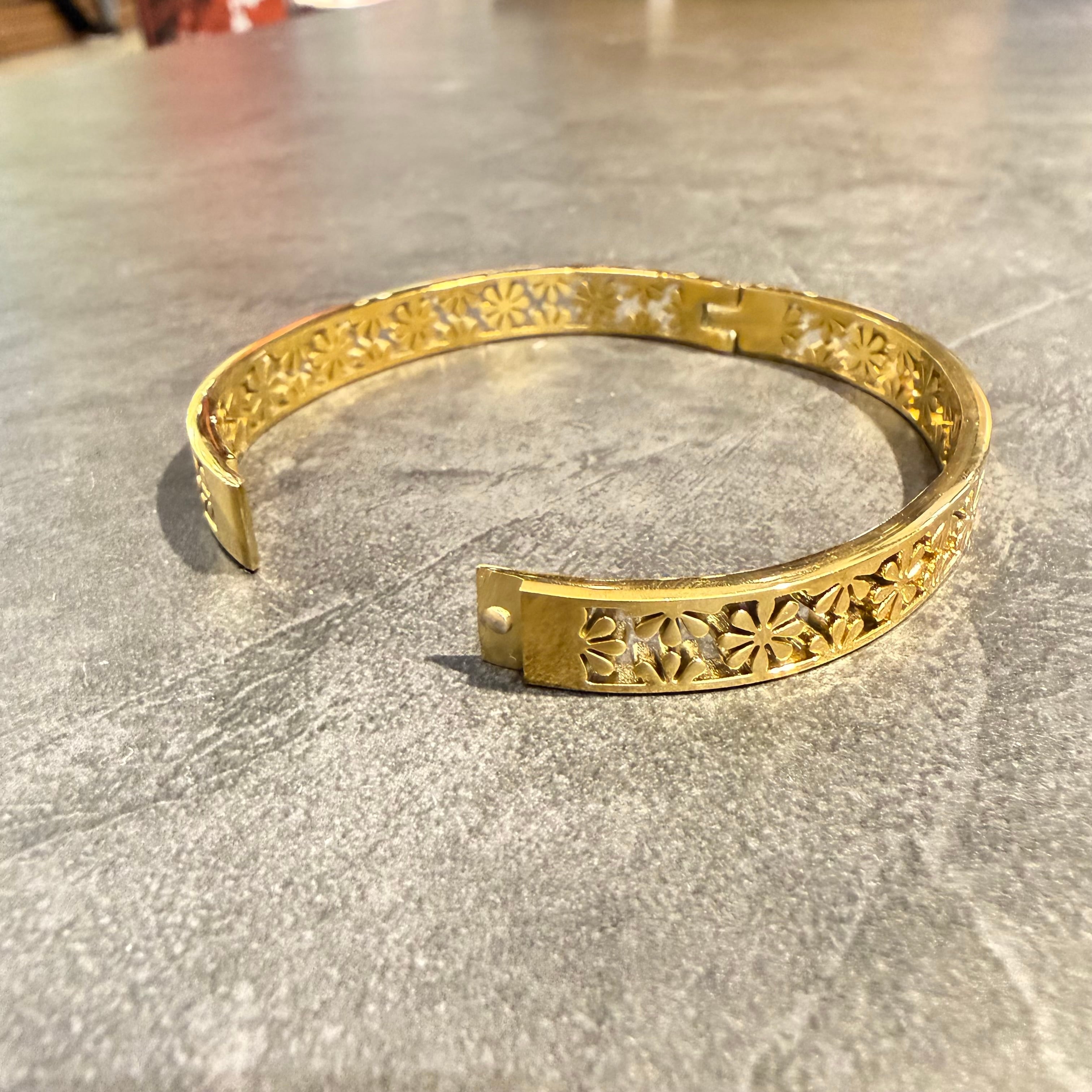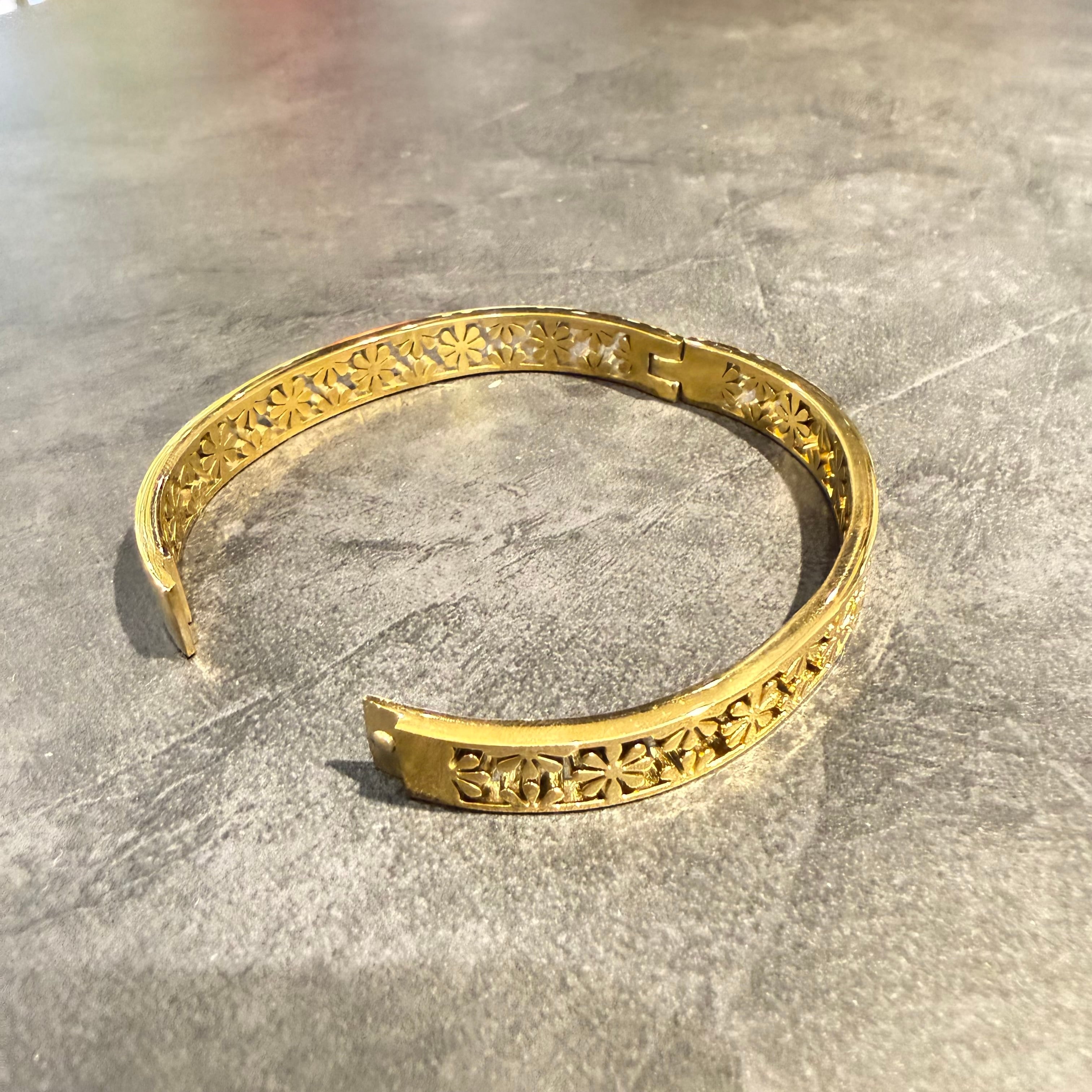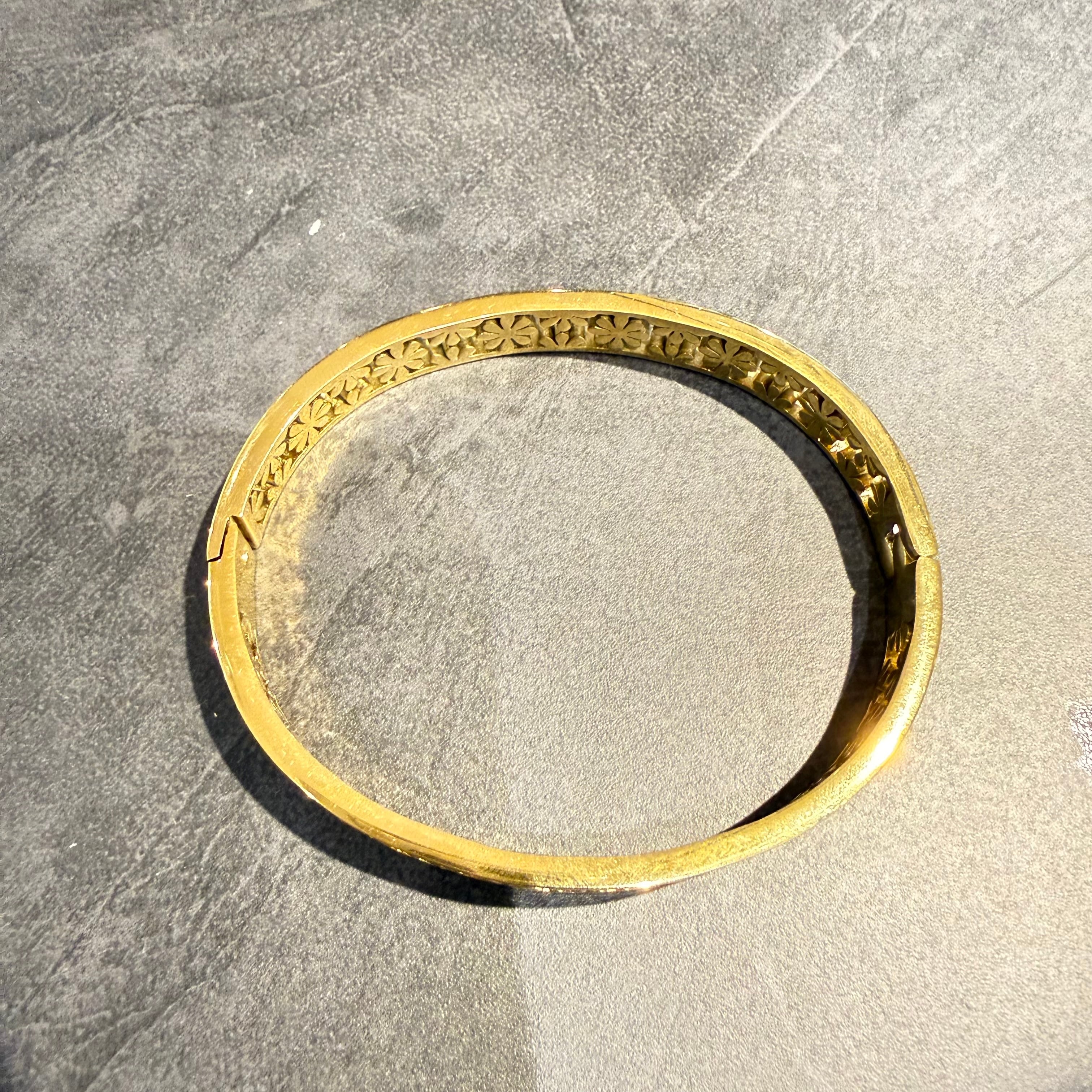繊細に彫刻されたフラワーデザインが連なる、存在感のあるゴールドバングル。