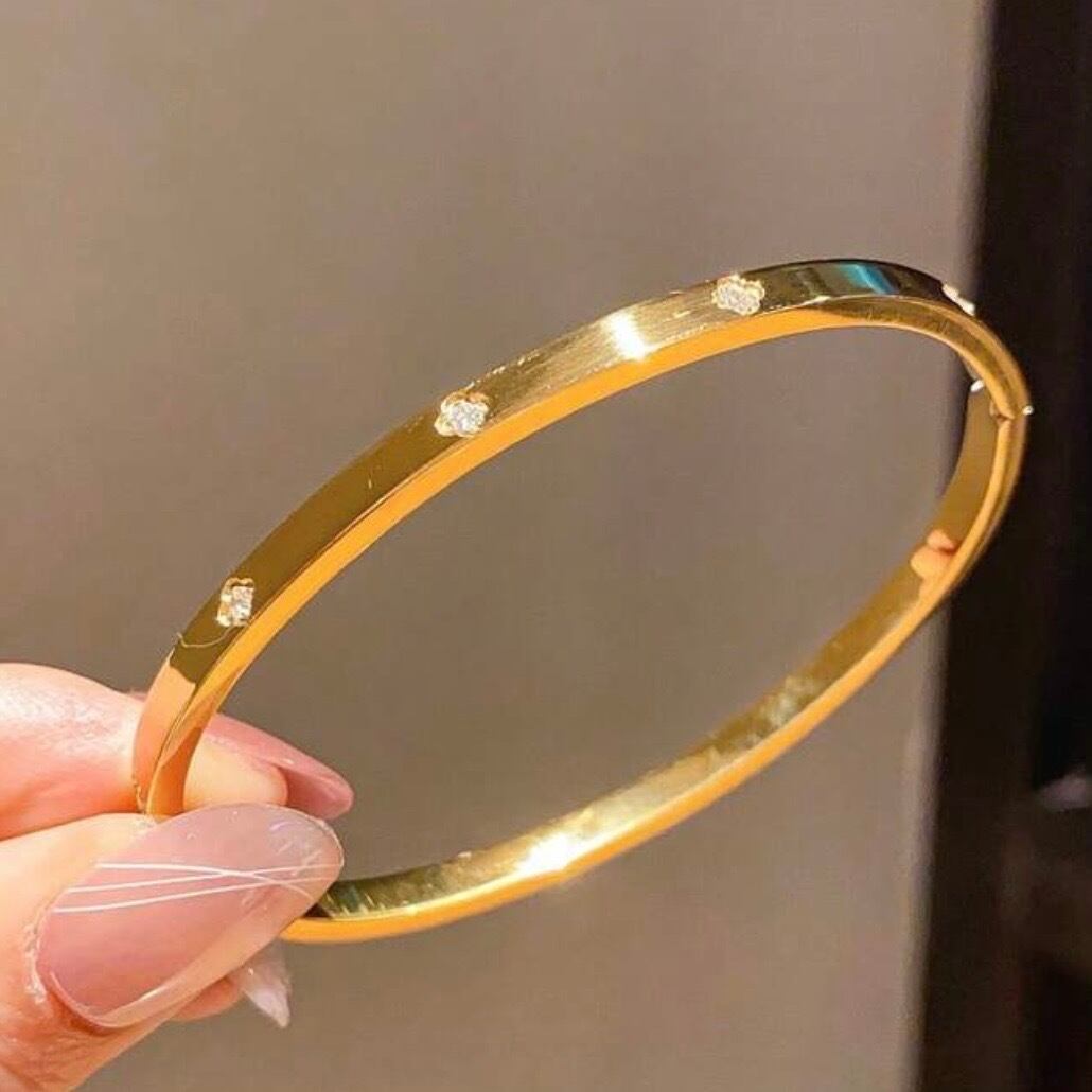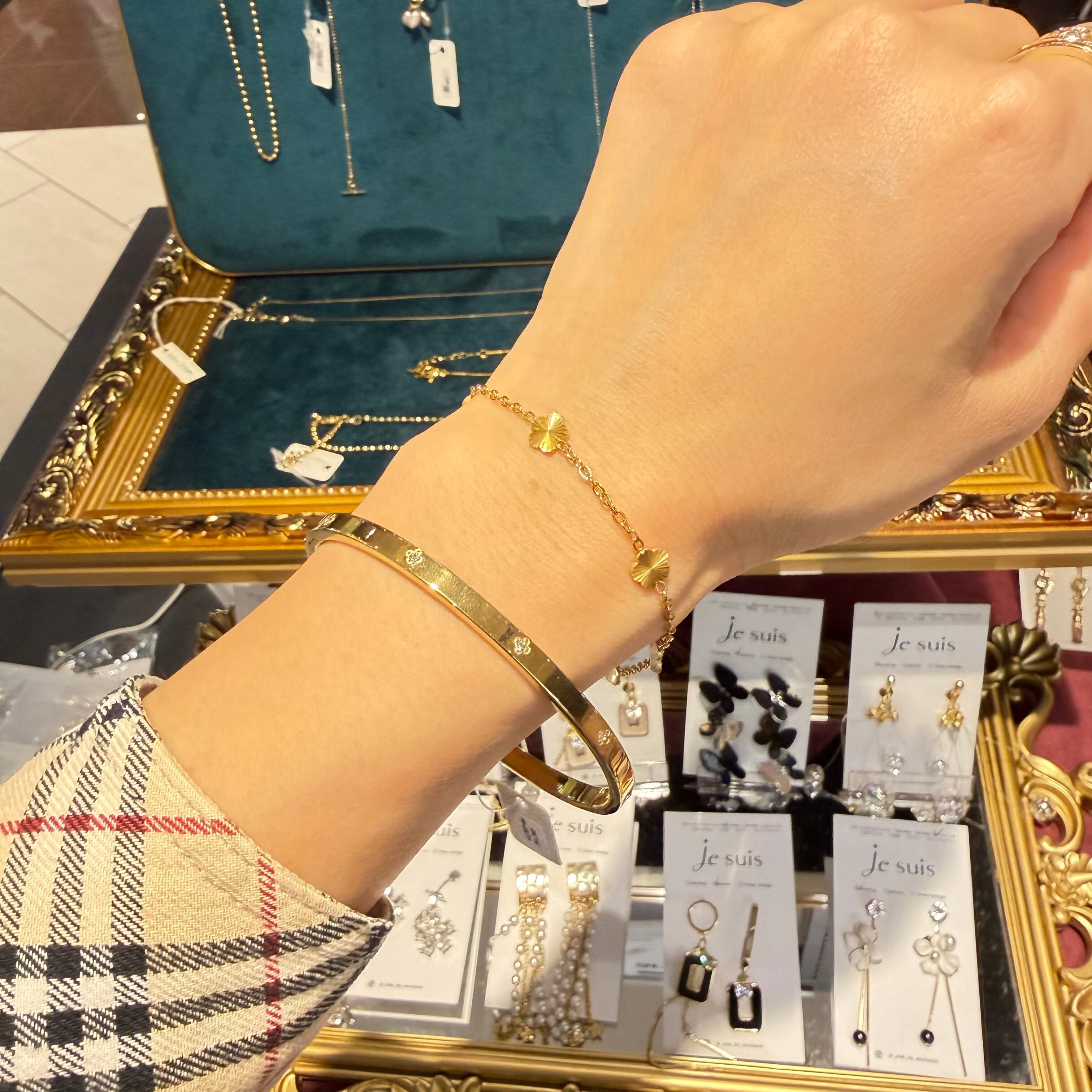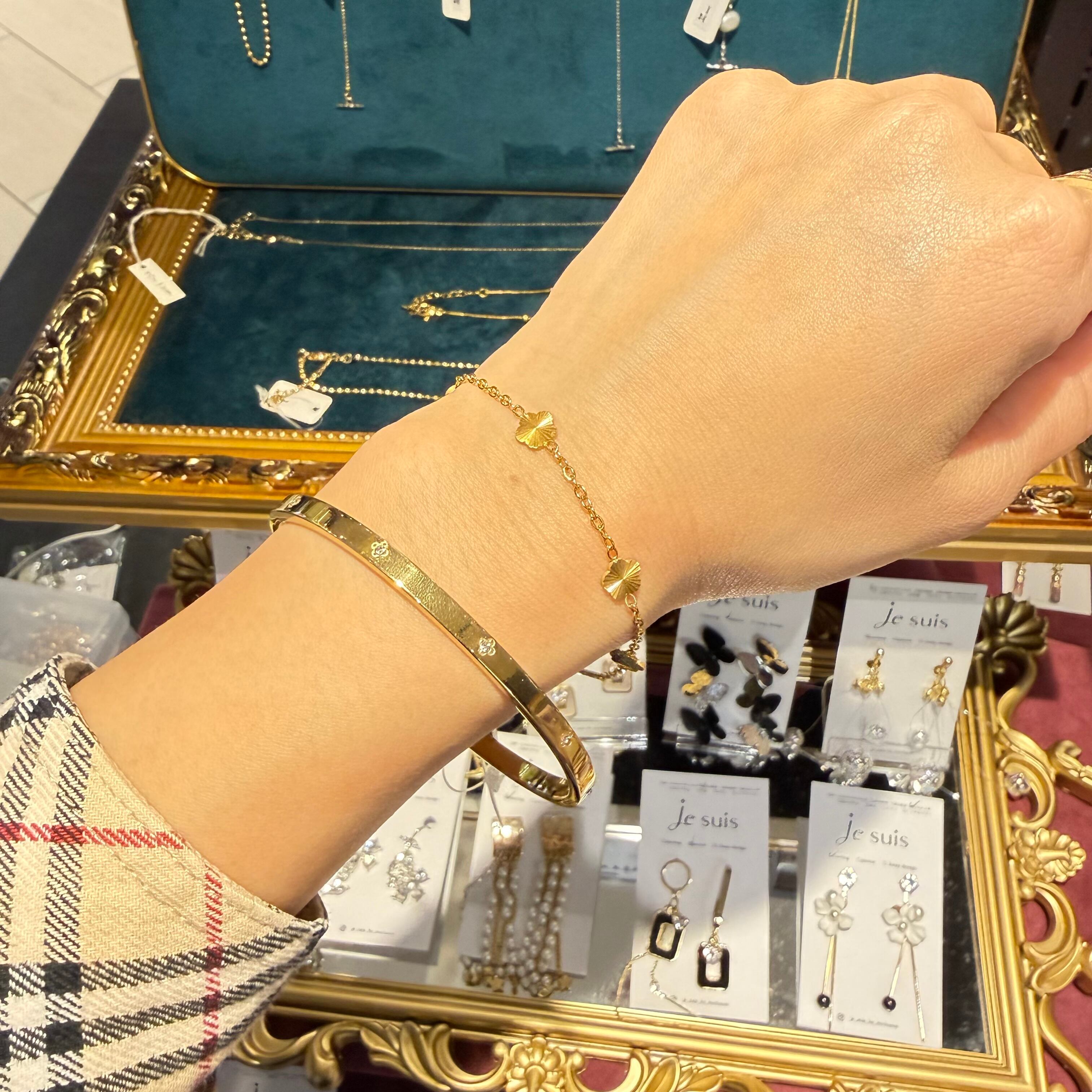細身のゴールドバングルに、四つ葉モチーフのストーンをあしらった上品な一本。