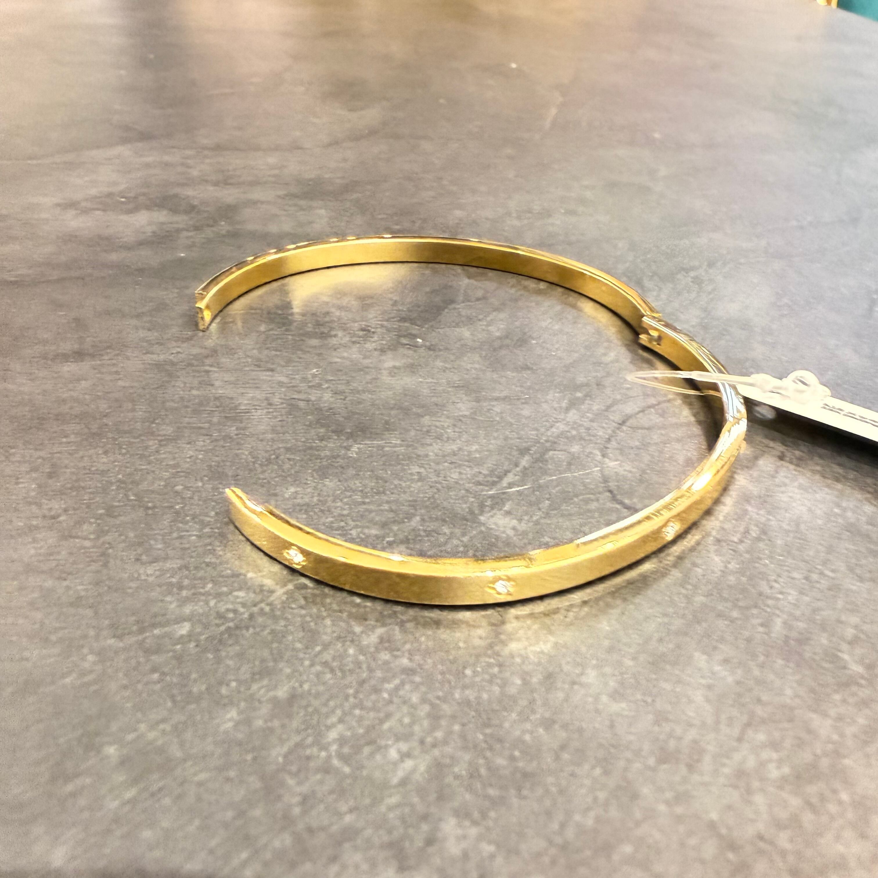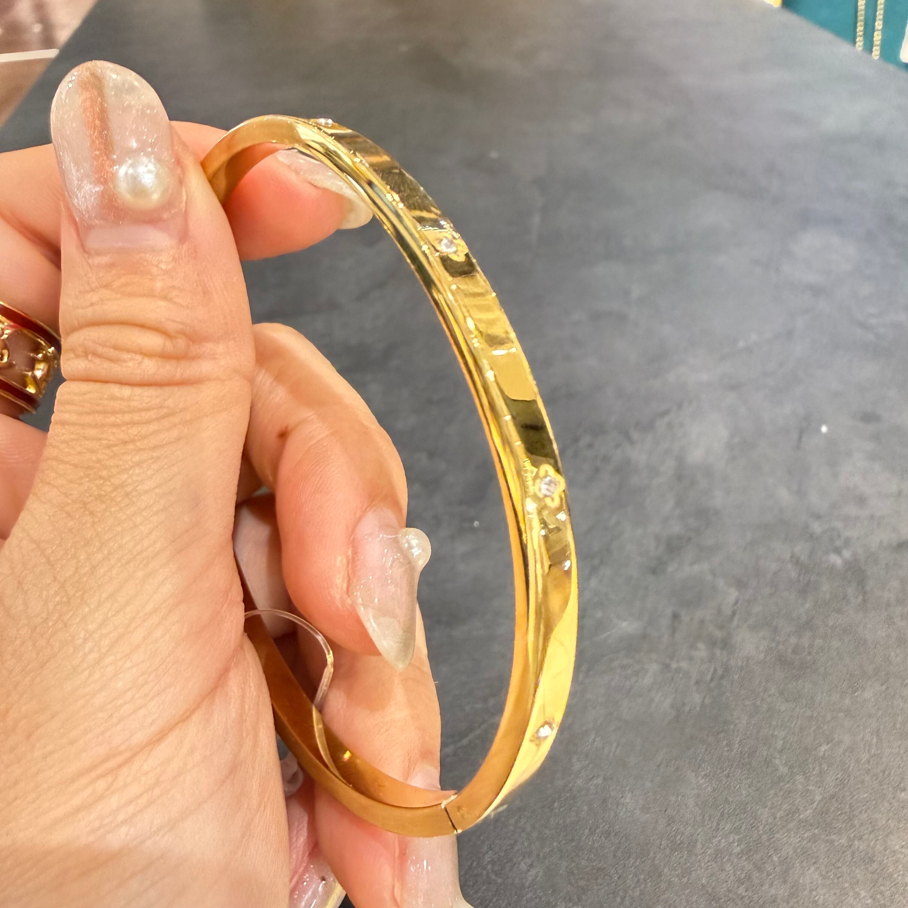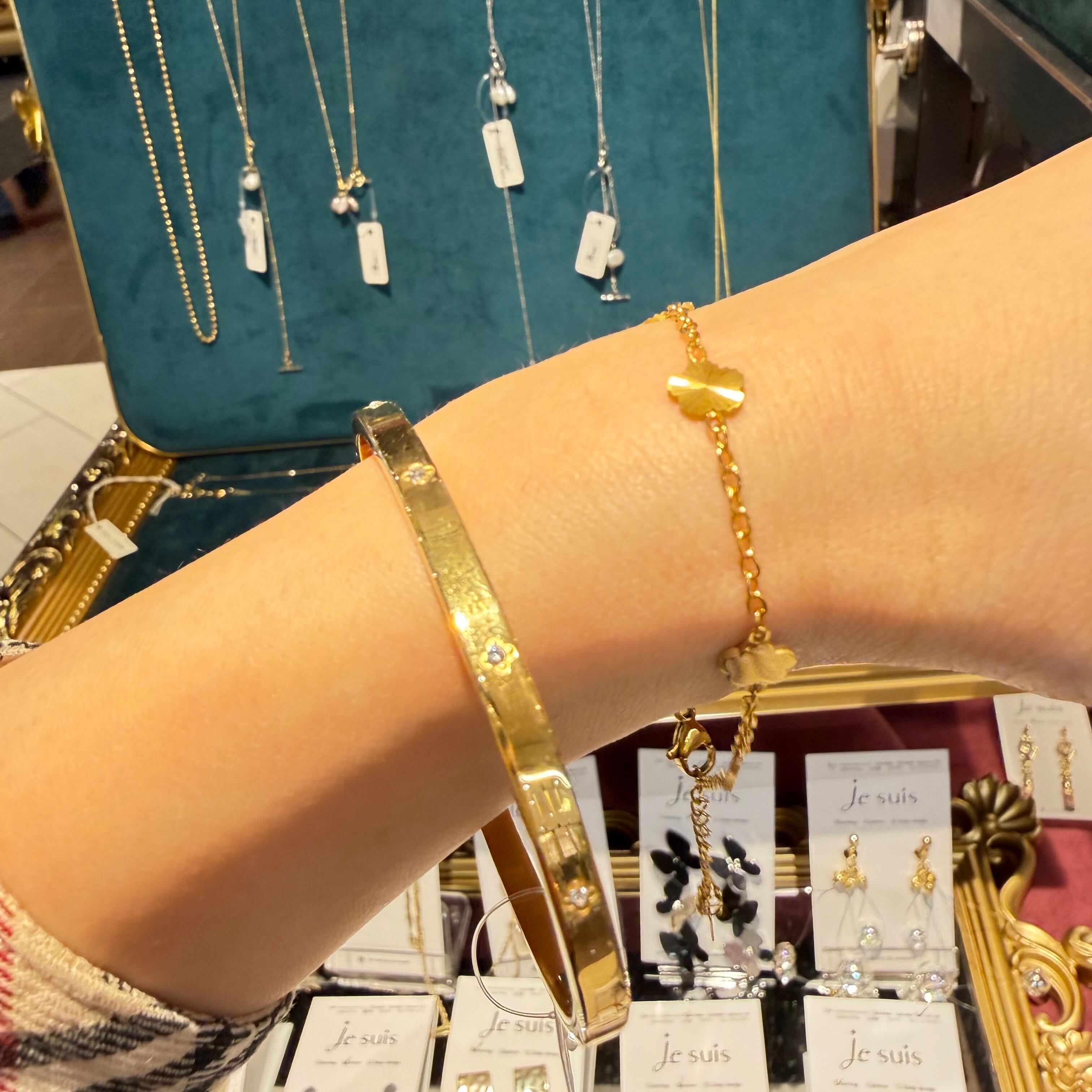 細身のゴールドバングルに、四つ葉モチーフのストーンをあしらった上品な一本。