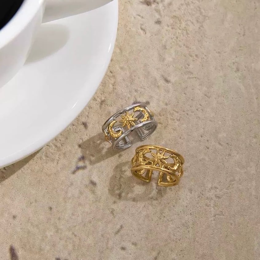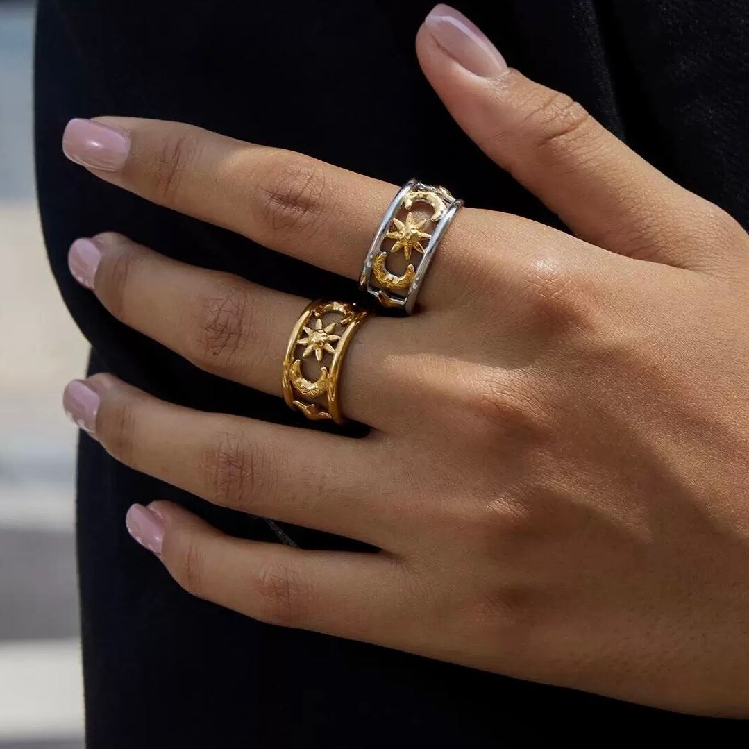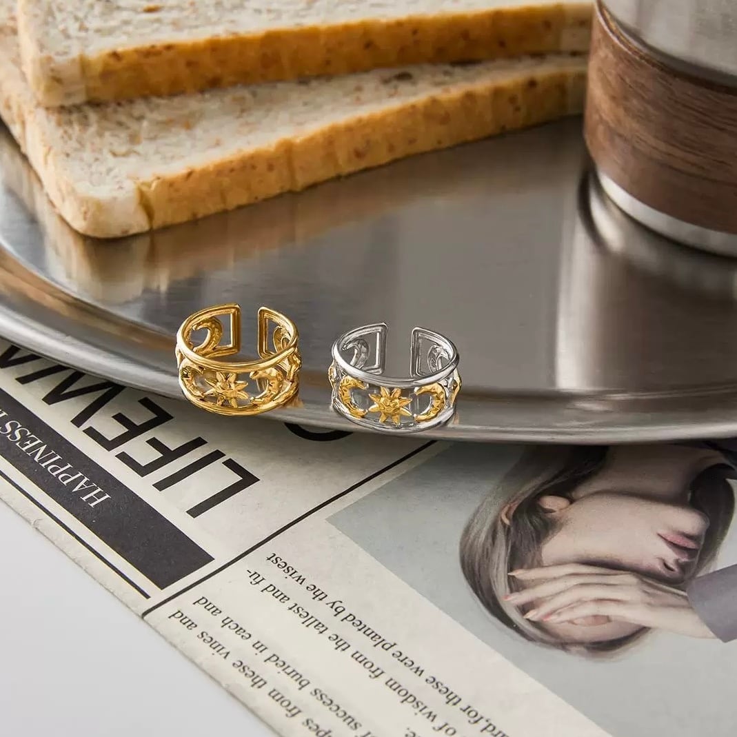 【フリーサイズ】サン&ムーン モチーフ ワイドリング(ゴールド/シルバー)
