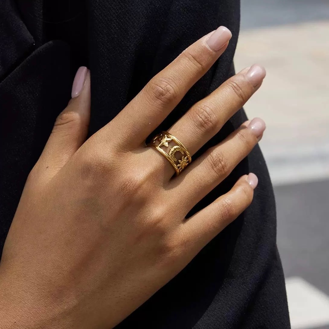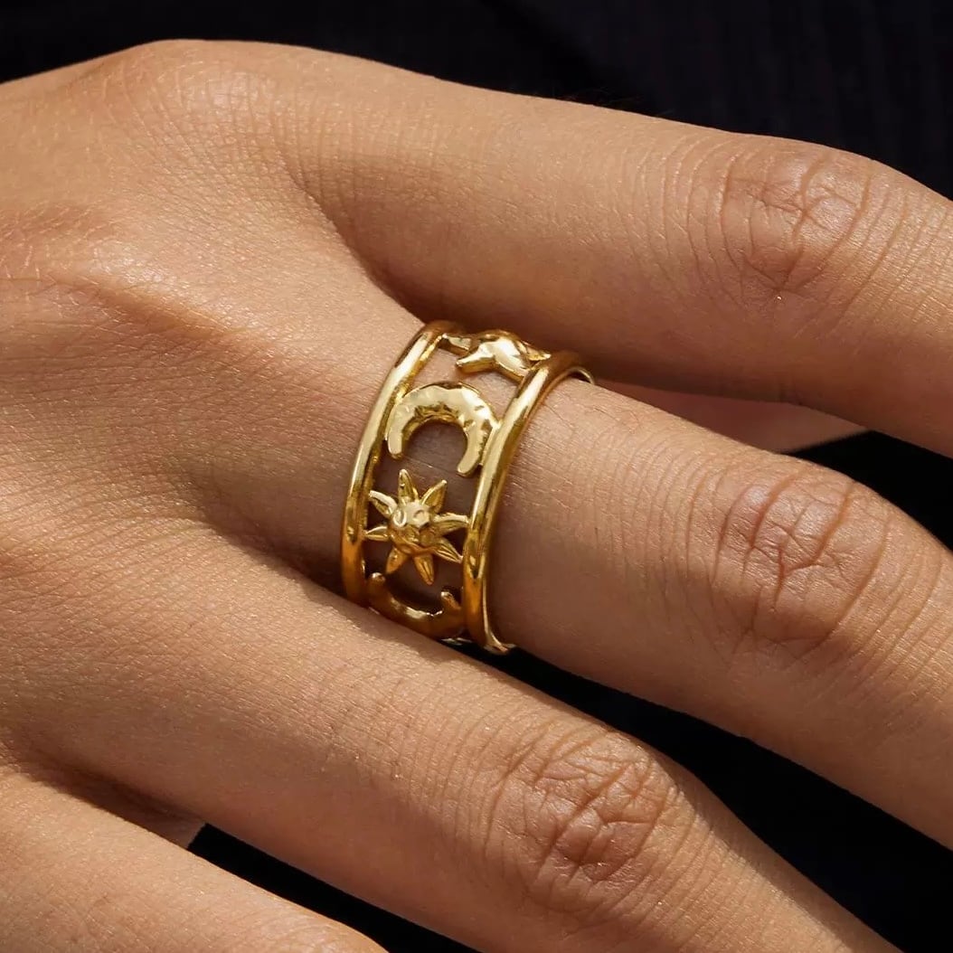 太めのワイドデザインに、太陽と三日月を立体的にあしらった印象的なモチーフリング。