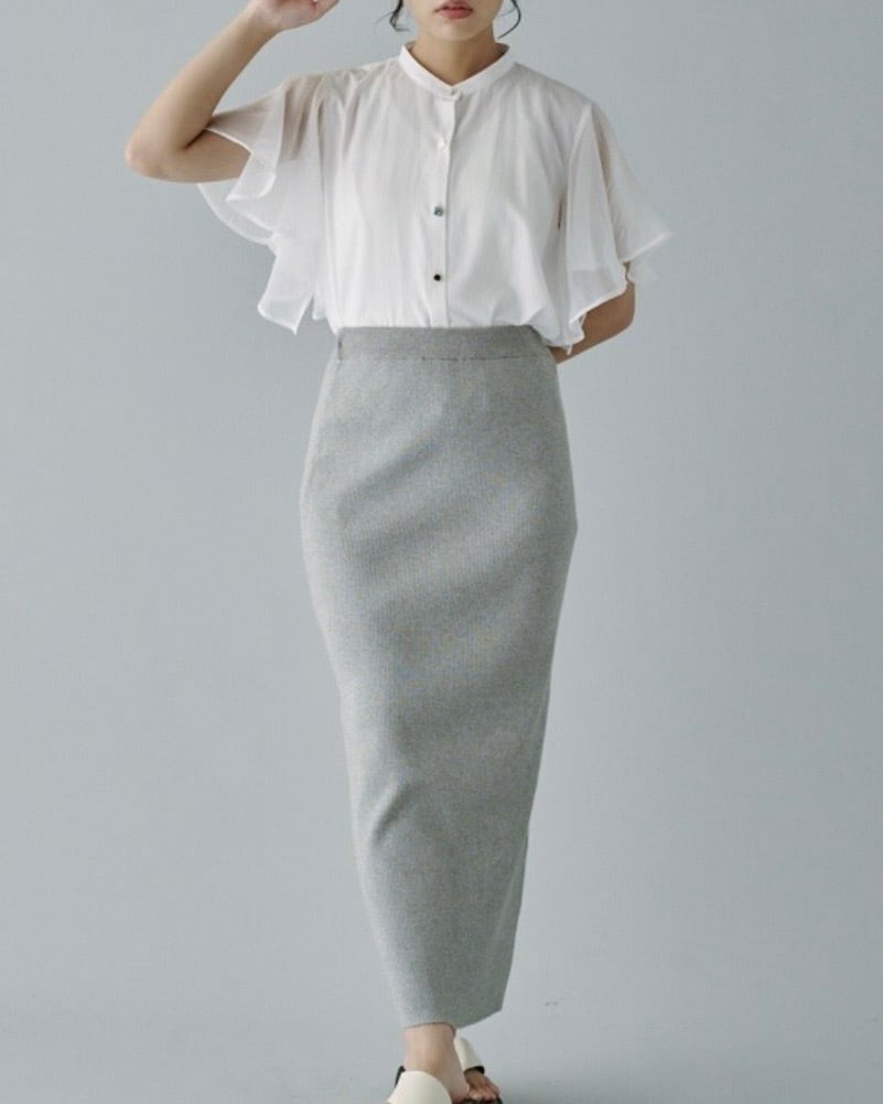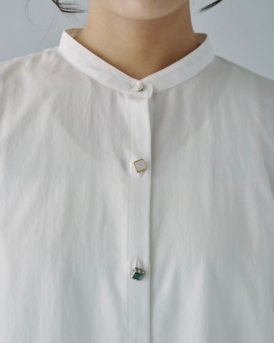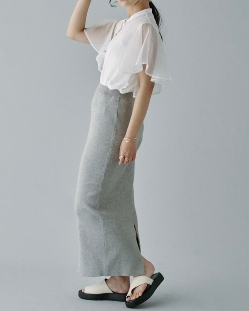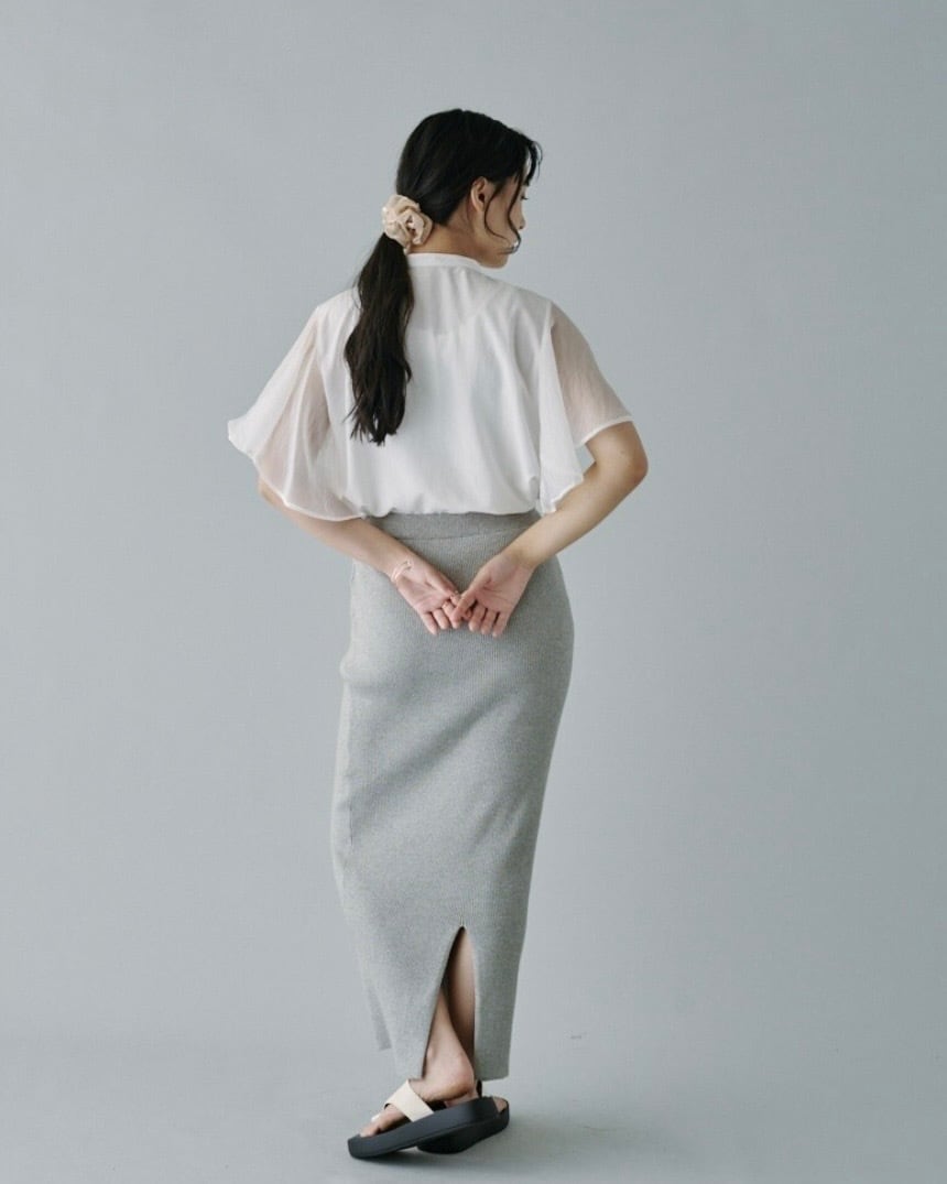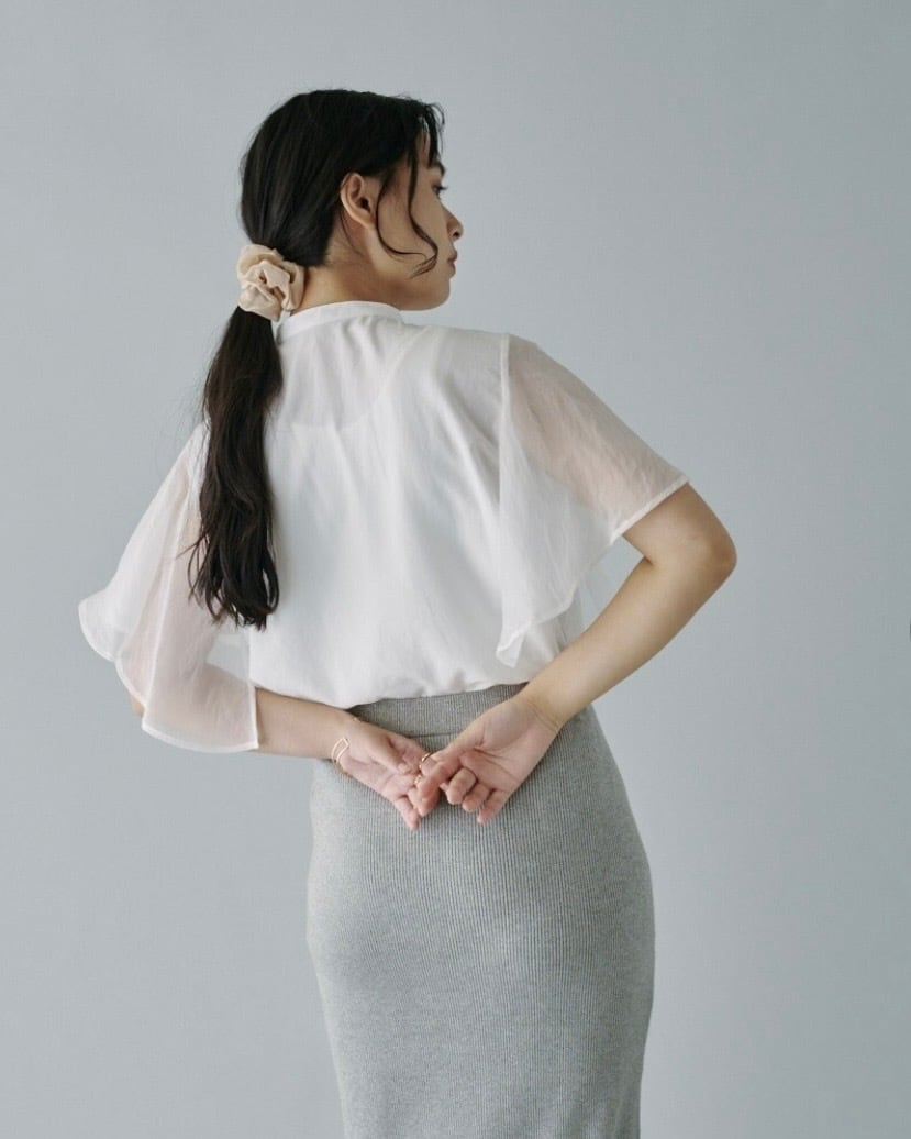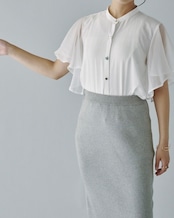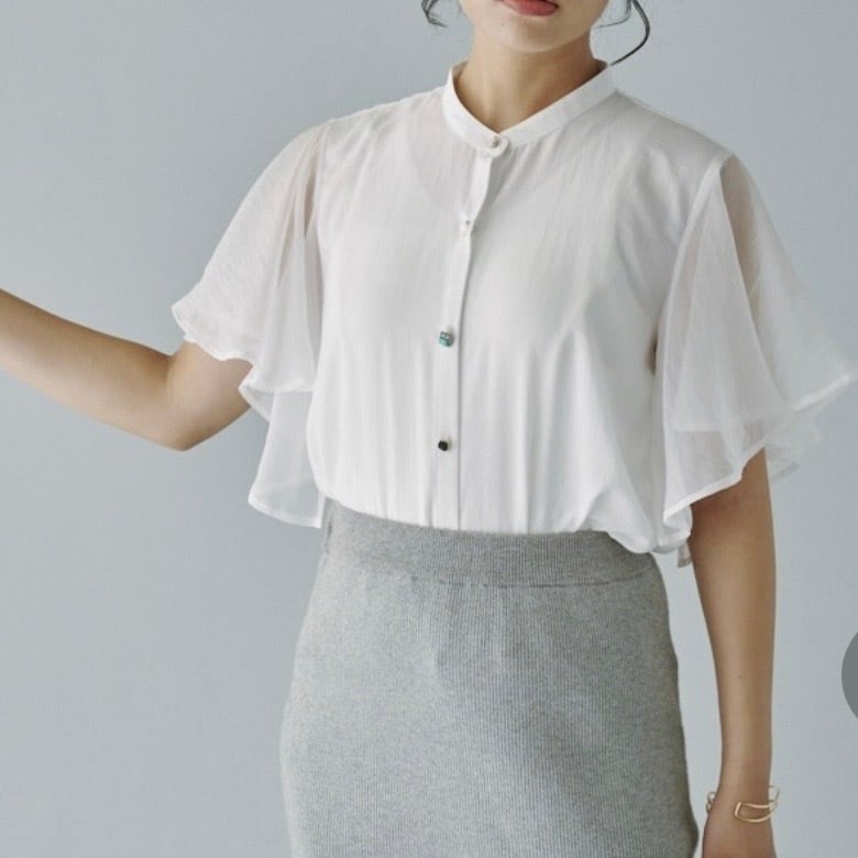【M〜L対応】シアーフレアスリーブ バリエーションボタンブラウス(ホワイト)