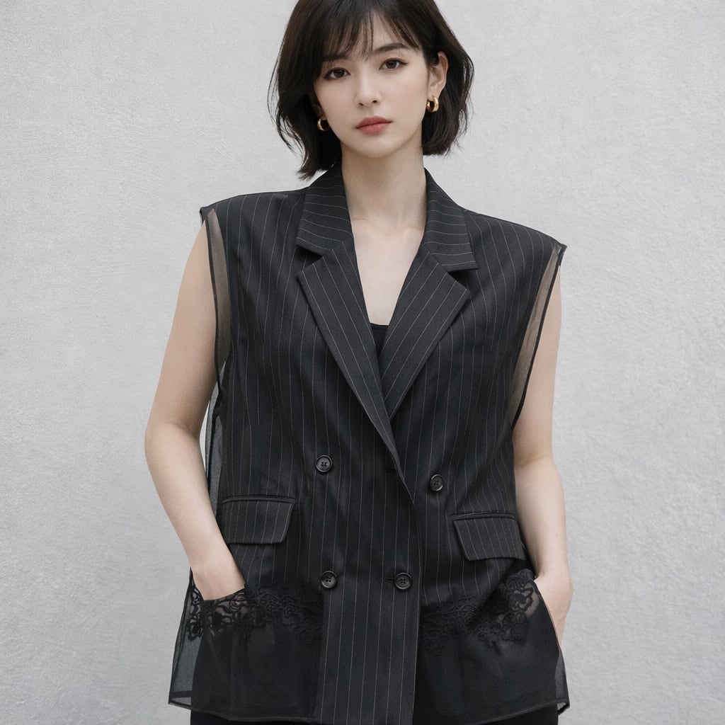 テーラードのきちんと感と、透け感の軽やかさを融合したモードベスト。