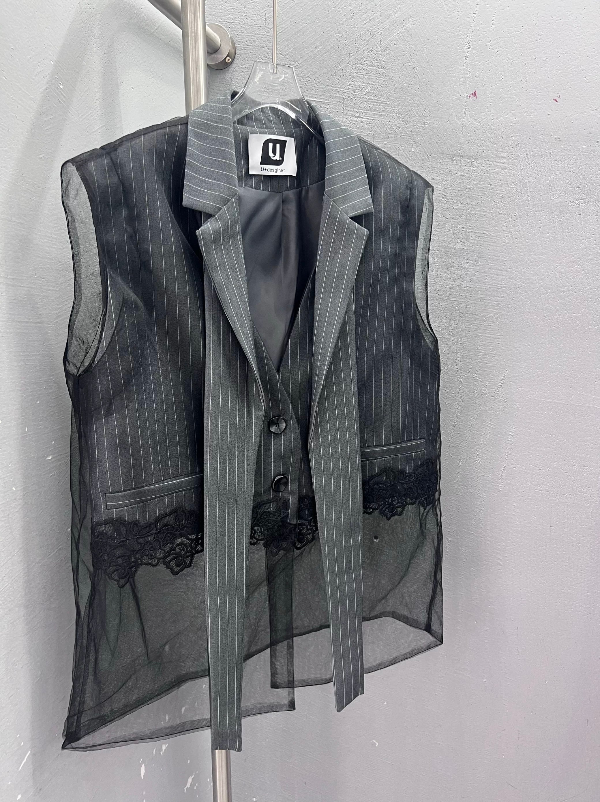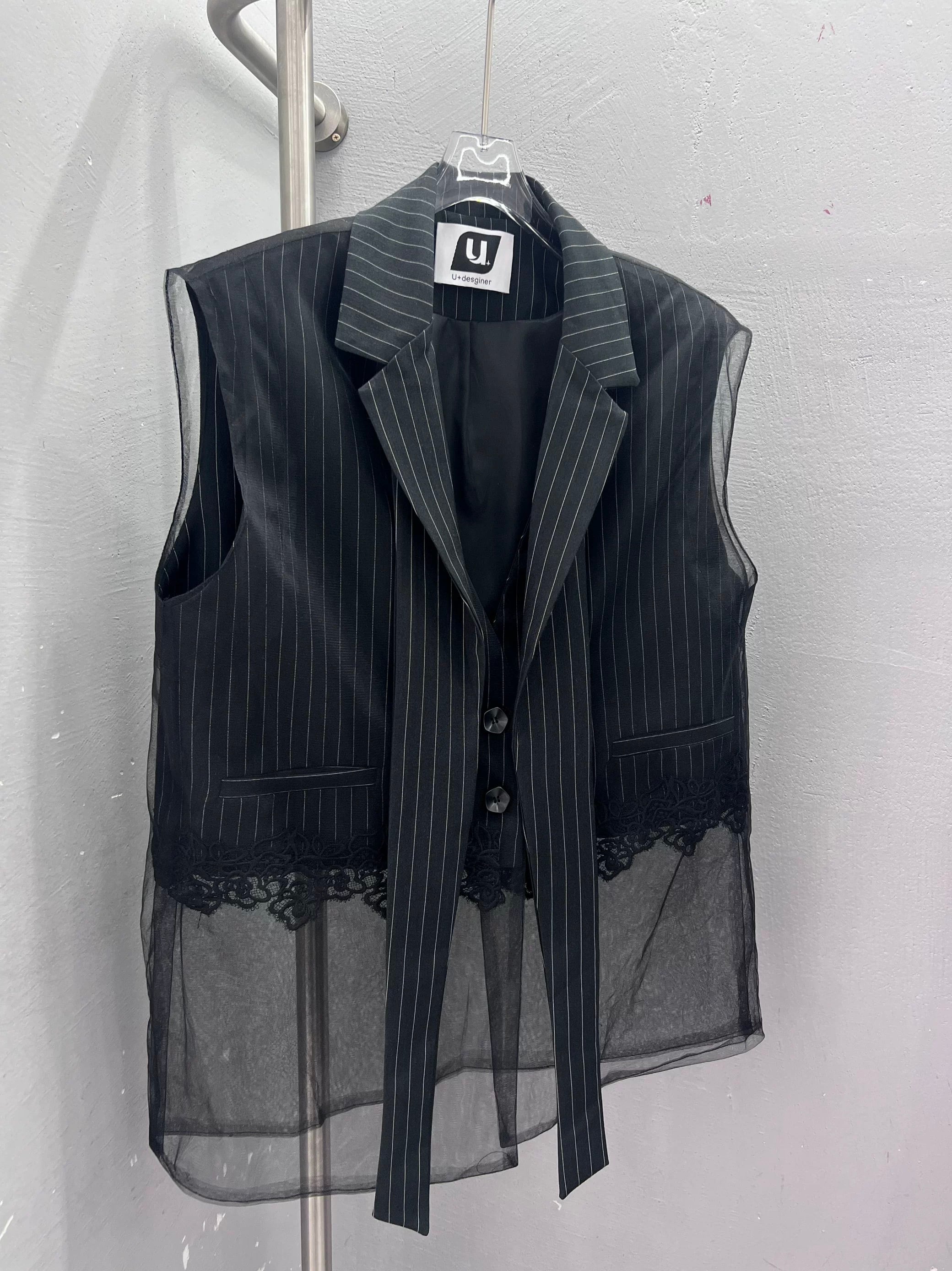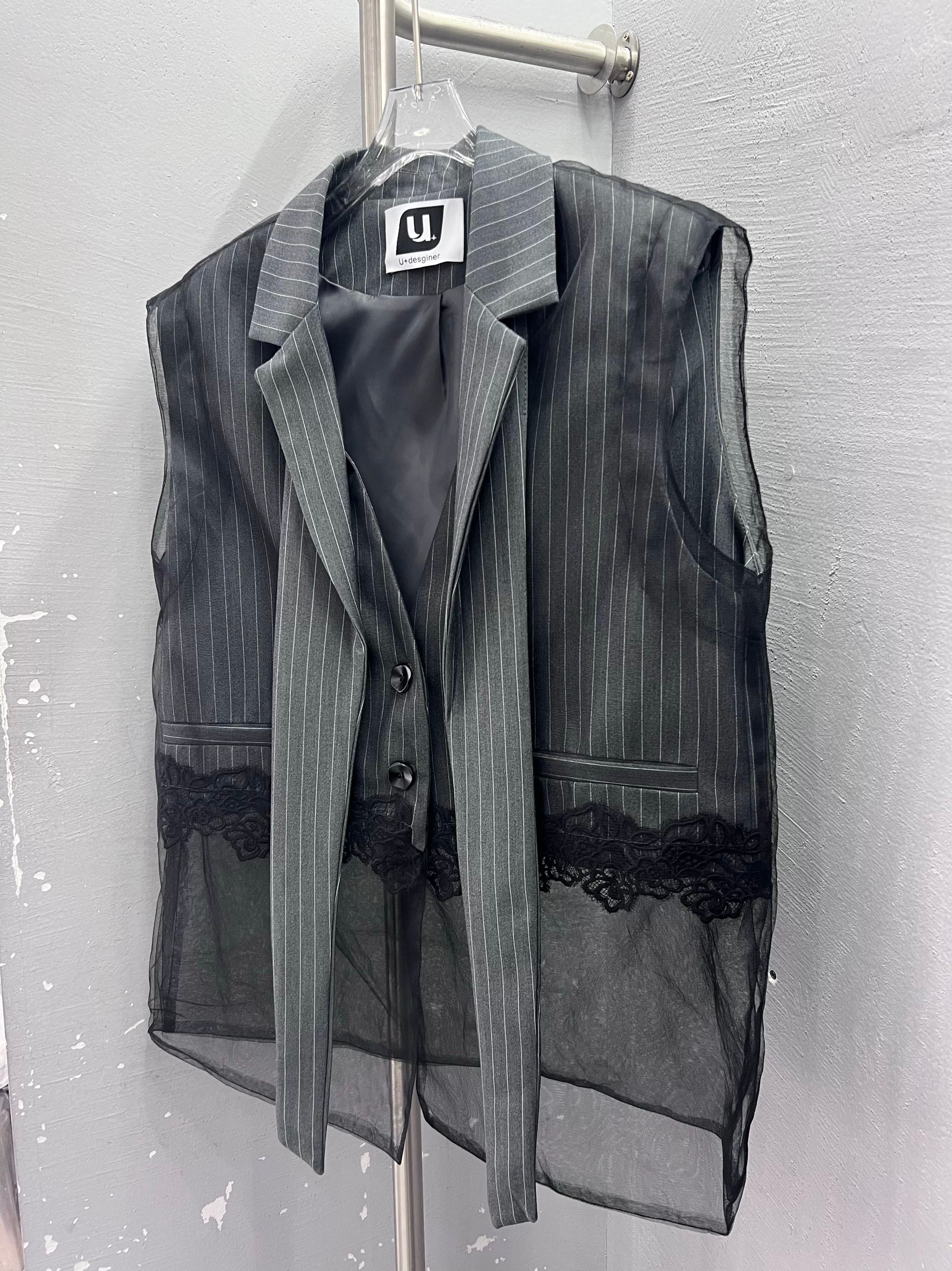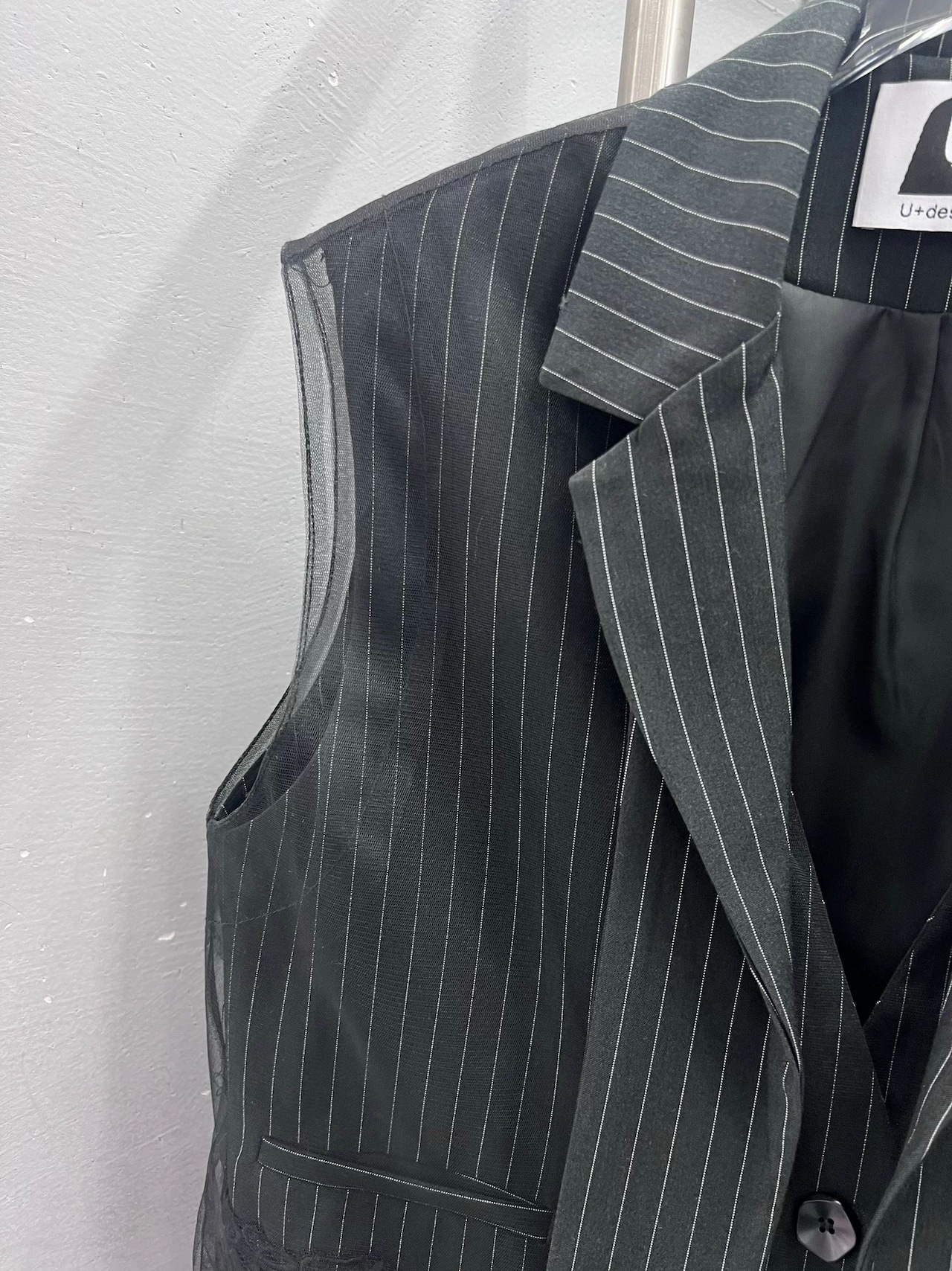 【ストライプ×シアーレース切替】テーラードデザインシアーベスト