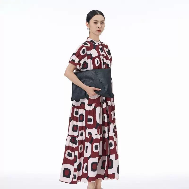大胆な幾何学柄が印象的なロングワンピースは、1枚でコーディネートが完成する主役級アイテム。