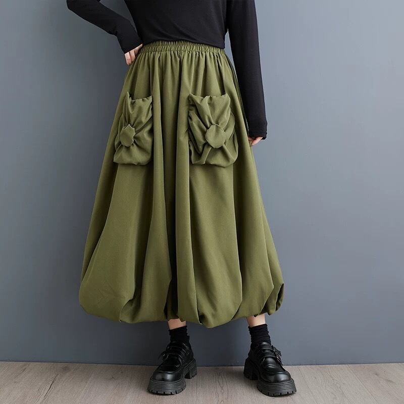 ウエストはゴム仕様で、幅広いサイズに対応し、1日中快適に過ごせます。色味は落ち着いたベージュとオリーブグリーンの2色展開で、シンプルながらも存在感のあるアイテムです。