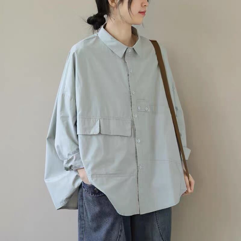 シンプルながらも個性的なデザインで、カジュアルなコーディネートにぴったりのシャツブラウスです。