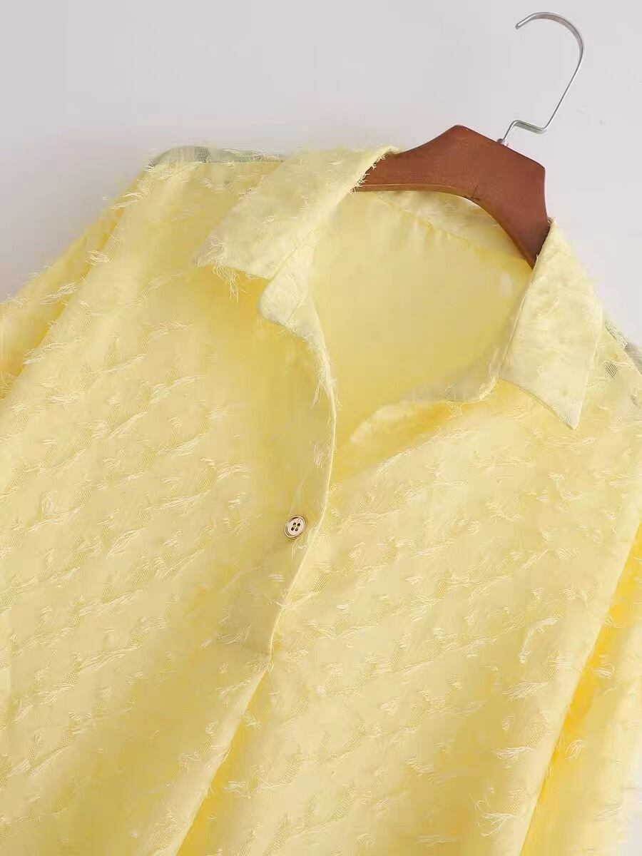 鮮やかなイエローカラーとフリンジデザインが目を引くブラウス。