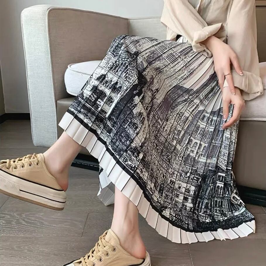 繊細なプリーツがゆらりと揺れ、動きを楽しむことができます。ウエスト部分はゴム仕様で、とても履きやすく体型に合わせて調整可能です。