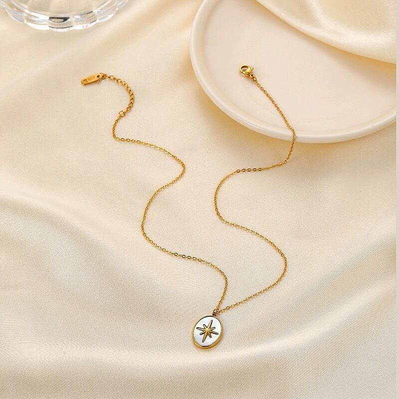 ゴールドのスターがきらりと輝くネックレスです。白い部分はシェル加工がしてあり、細部までこだわっています。