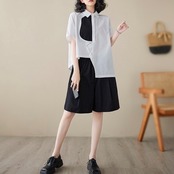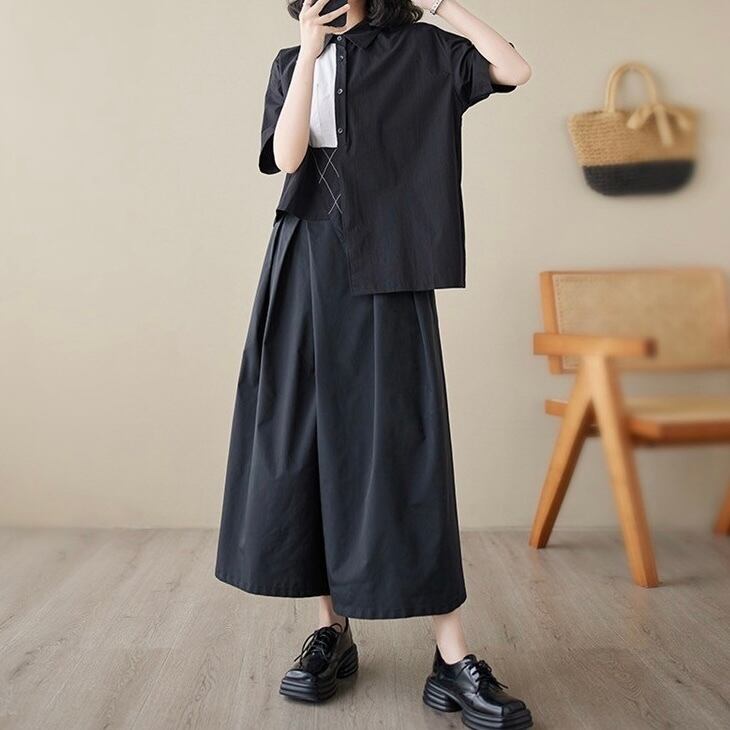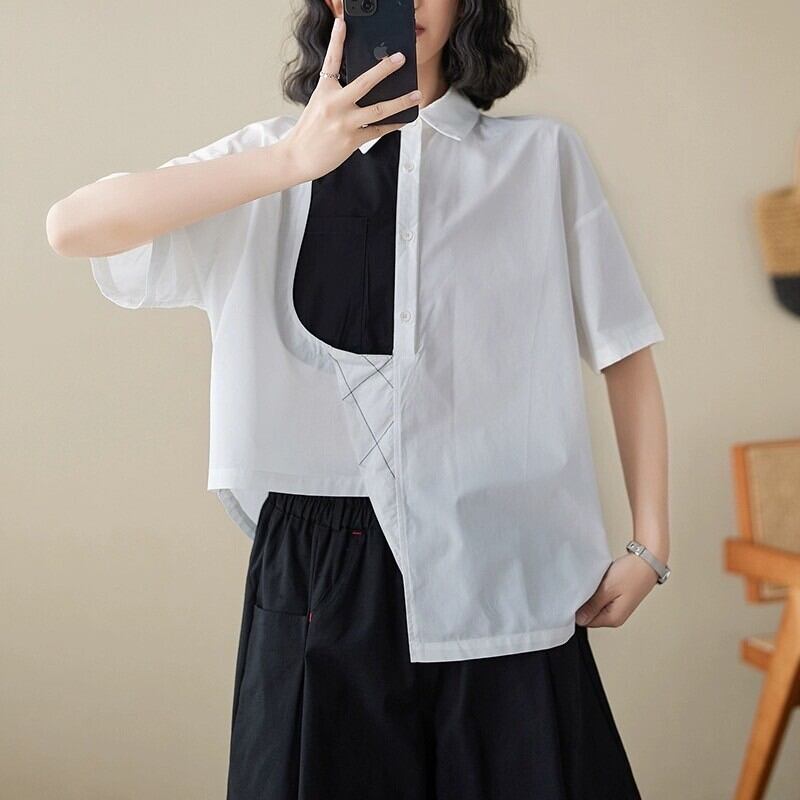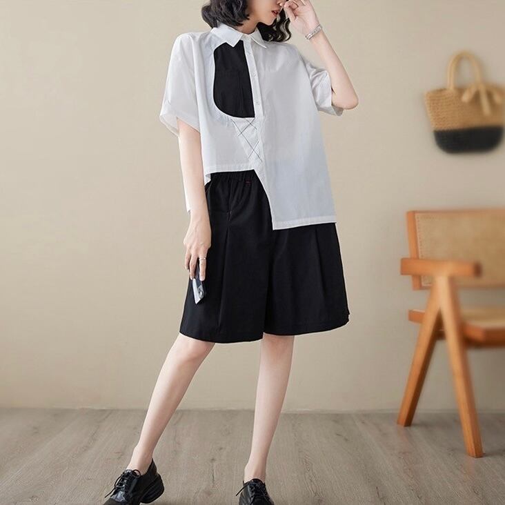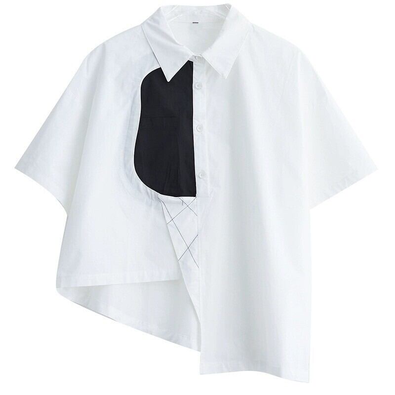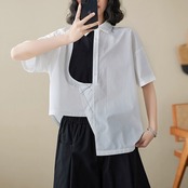 アシンメトリーデザインの襟付き半袖シャツ。
