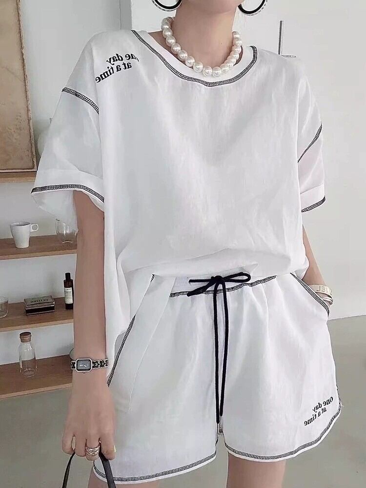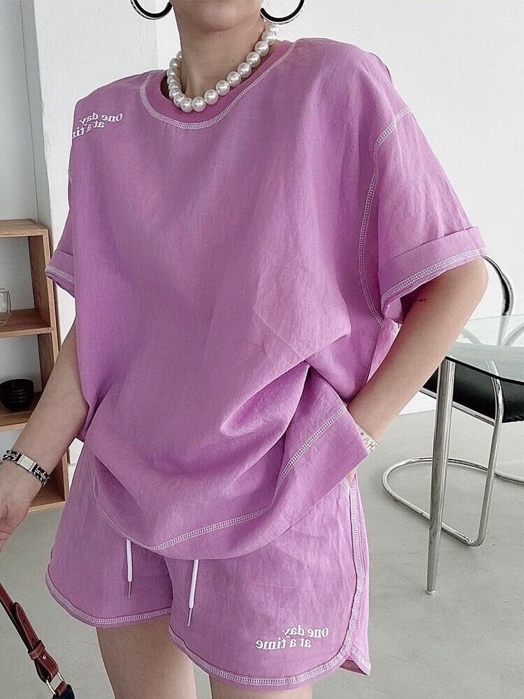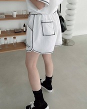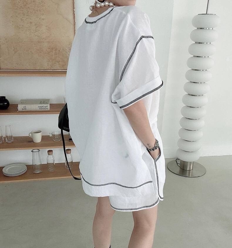 ライン使いがオシャレな半袖Tシャツとショートパンツがセットになっております。お出かけやリラックスタイムに、または運動をされる方にもぴったりなアイテムです。パンツのウエスト部分はドローコードになっており、調節可能です。カラーは3展開、お気に入りの一着を見つけてください。