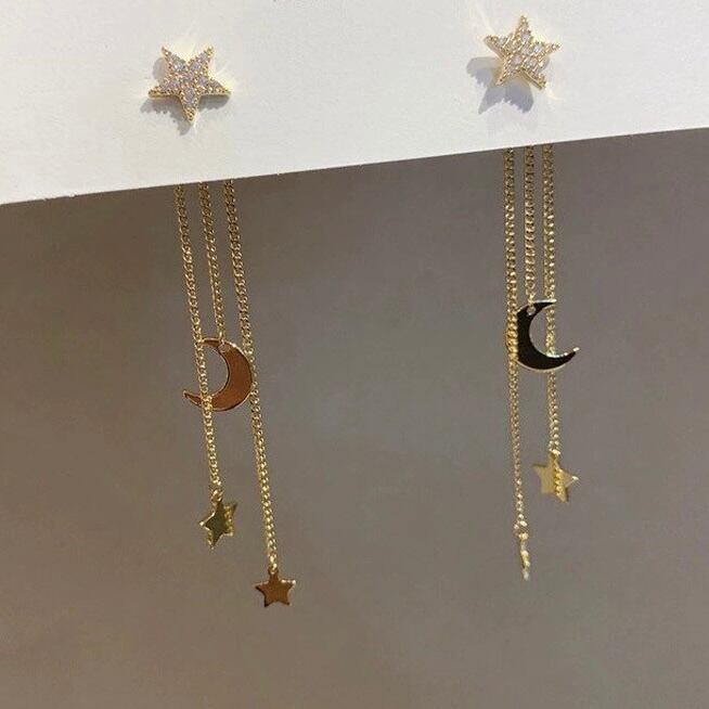 ゆらゆらと揺れる星と三日月のモチーフが上品な輝きを放つ、まるで夜空のようなピアス。