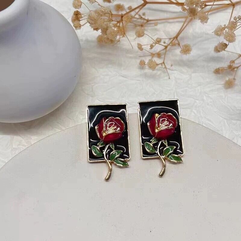 まるで絵画の中から出てきたような真っ赤なバラの花が印象的な、スクエア型のピアス&イヤリング。