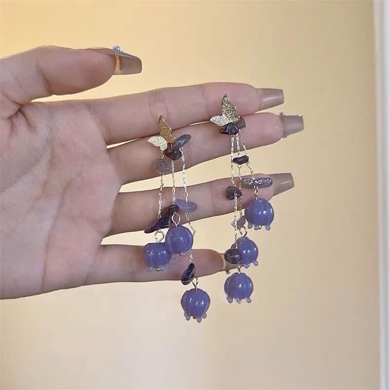 ゆらゆらと揺れるスズランのモチーフと、まるでその上にとまっているかのような蝶が愛らしいピアス&イヤリングです。