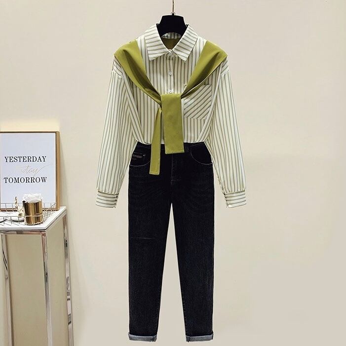 カーディガンを肩から掛けたような、1枚でファッショナブルに仕上がるストライプシャツ。
