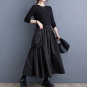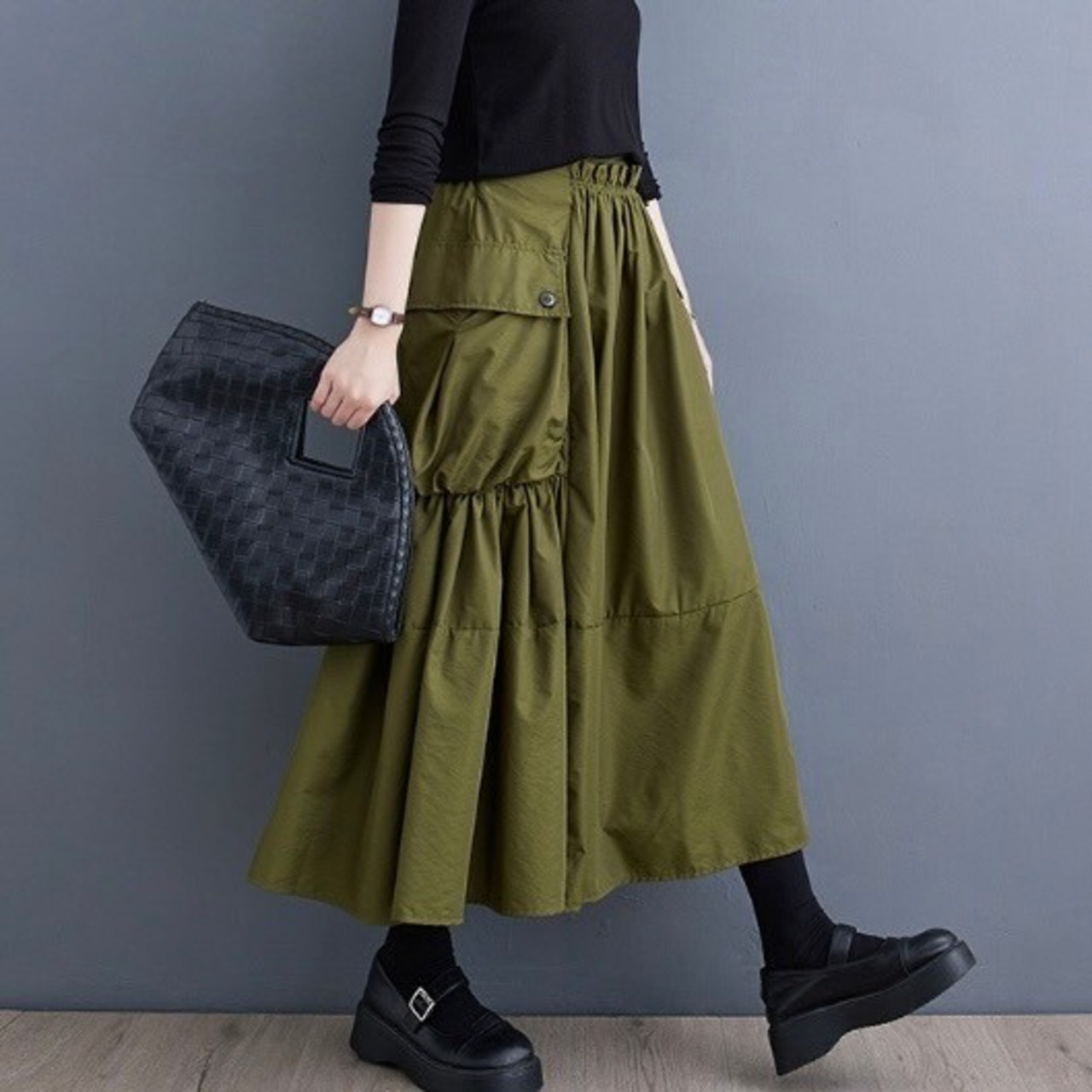 大きめのサイドポケットと動くたびに美しく揺れるシルエットが特徴のスカート。