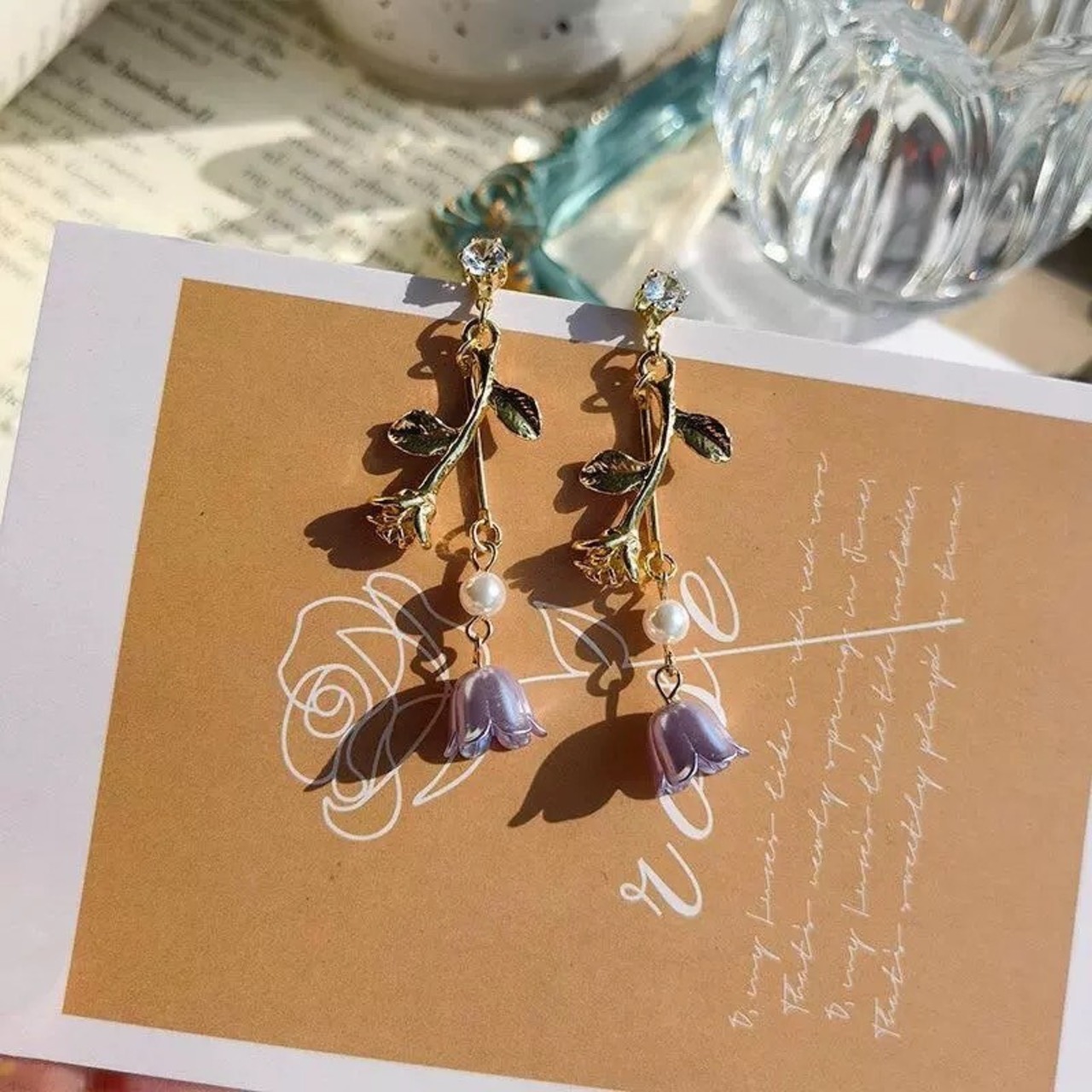 ゴールドの薔薇とパープルのスズランのモチーフの組み合わせが贅沢なピアス。