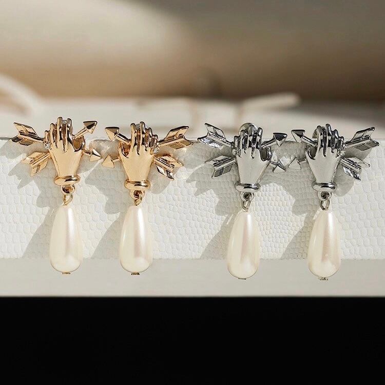 矢を持つ手のモチーフとしずく型のパールのピアス。